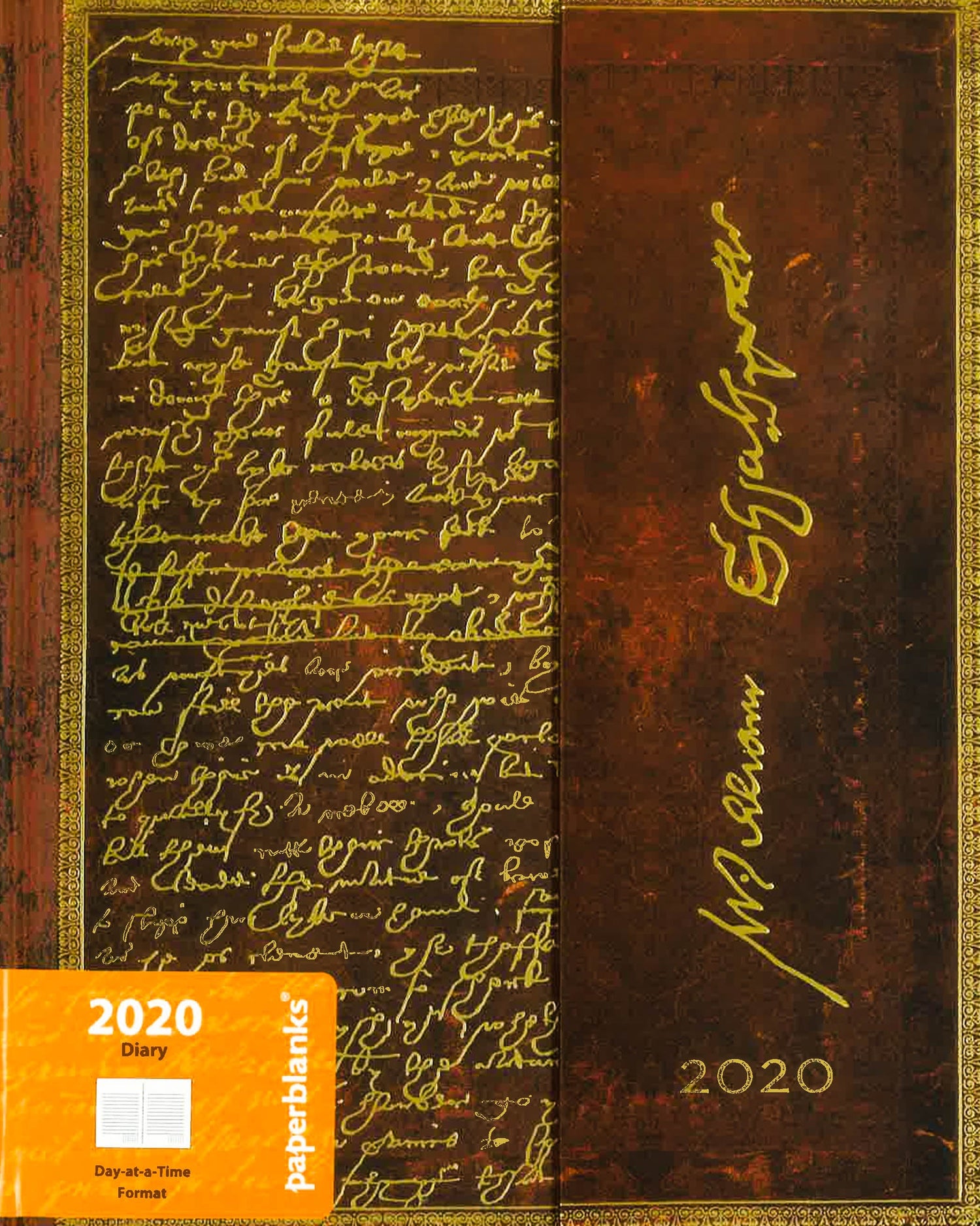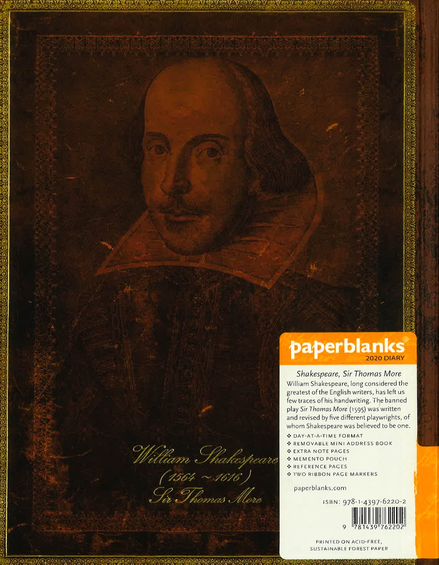 William Shakespeare (15641616), long considered the greatest of English writers, left few traces of his handwriting. The banned play Sir Thomas More (1595) was written and revised by five different playwrights, of whom scholars now believe Shakespeare to be one. The handwritten manuscript on this Paperblanks 2020 12-Month Diary cover portrays his passionate defence of refugees and displaced people.
