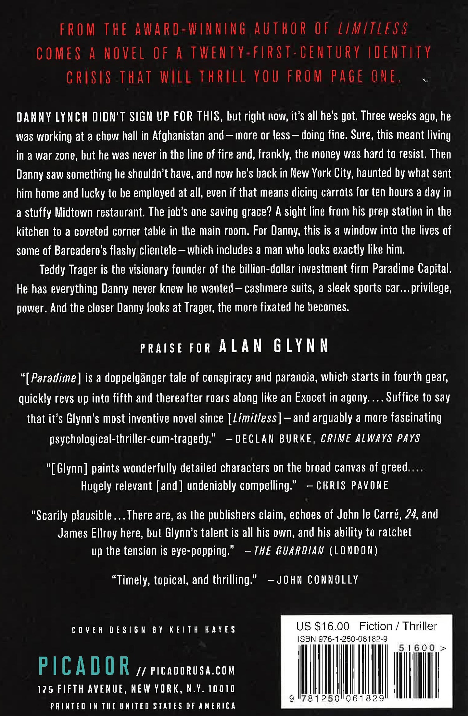 From Alan Glynn, the award-winning author of Limitless, comes a novel of a twenty-first-century identity crisis that will thrill you from page one. Danny Lynch didn't sign up for this, but right now, it's all he's got. Three weeks ago, he was working at a chow hall in Afghanistan and--more or less--doing fine. Sure, this meant living in a war zone, but he was never in the line of fire and, frankly, the money was hard to resist. Then Danny saw something he shouldn't have, and now he's back in New York City, haunted by what sent him home and lucky to be employed at all, even if that means dicing carrots for ten hours a day in a stuffy Midtown restaurant. The job's one saving grace? A sight line from his prep station in the kitchen to a coveted corner table in the main room. For Danny, this is a window into the lives of some of Barcadero's flashy clientele--and one evening, he sees a man who looks exactly like him. Teddy Trager is the visionary founder of the billion-dollar investment firm Paradime Capital. He has everything Danny never knew he wanted--cashmere suits, a sleek sports car . . . privilege, power--and the closer Danny looks at Trager the more fixated he becomes.