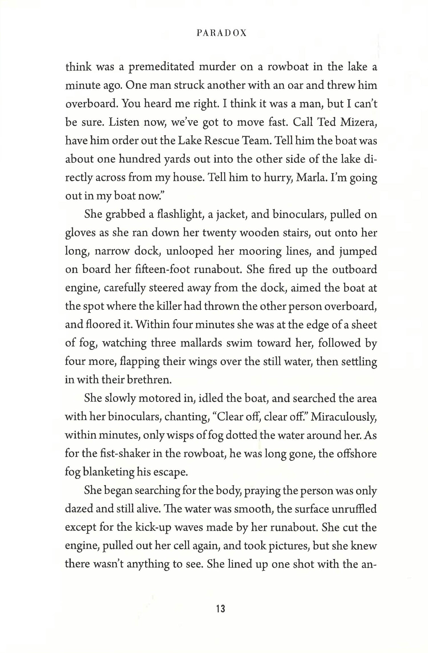 Chief Ty Christie of Willicott, Maryland, witnesses a murder at dawn from the deck of her cottage on Lake Massey. When dragging the lake, not only do the divers find the murder victim, they also discover dozens of bones. Even more shocking is the identification of a unique belt buckle found among the bones. Working together with Chief Christie, Savich and Sherlock soon discover a frightening connection between the bones and the escaped psychopath.Paradox is a chilling mix of Dr. Jekyll and Mr. Hyde, old secrets that refuse to stay buried, and ruthless greed that keep Savich and Sherlock and Chief Ty Christie working at high speed to uncover the truth before their own bones end up at the bottom on the lake.
