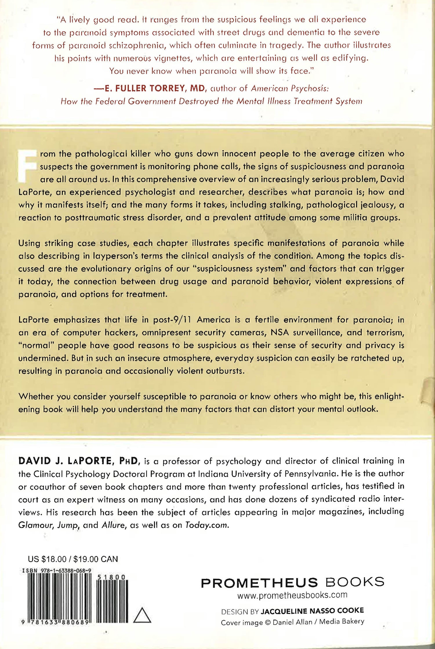 From the pathological killer who gunned down the innocents at Virginia Tech to the average citizen who suspects the government is monitoring phone calls, the signs of suspiciousness and paranoia are all around us. In this comprehensive overview of an increasingly serious problem, an experienced psychologist and researcher describes what paranoia is, how and why it manifests itself, and the many forms it takes, including stalking, pathological jealousy, as a reaction to post-traumatic stress disorder, and perhaps even militia movements.