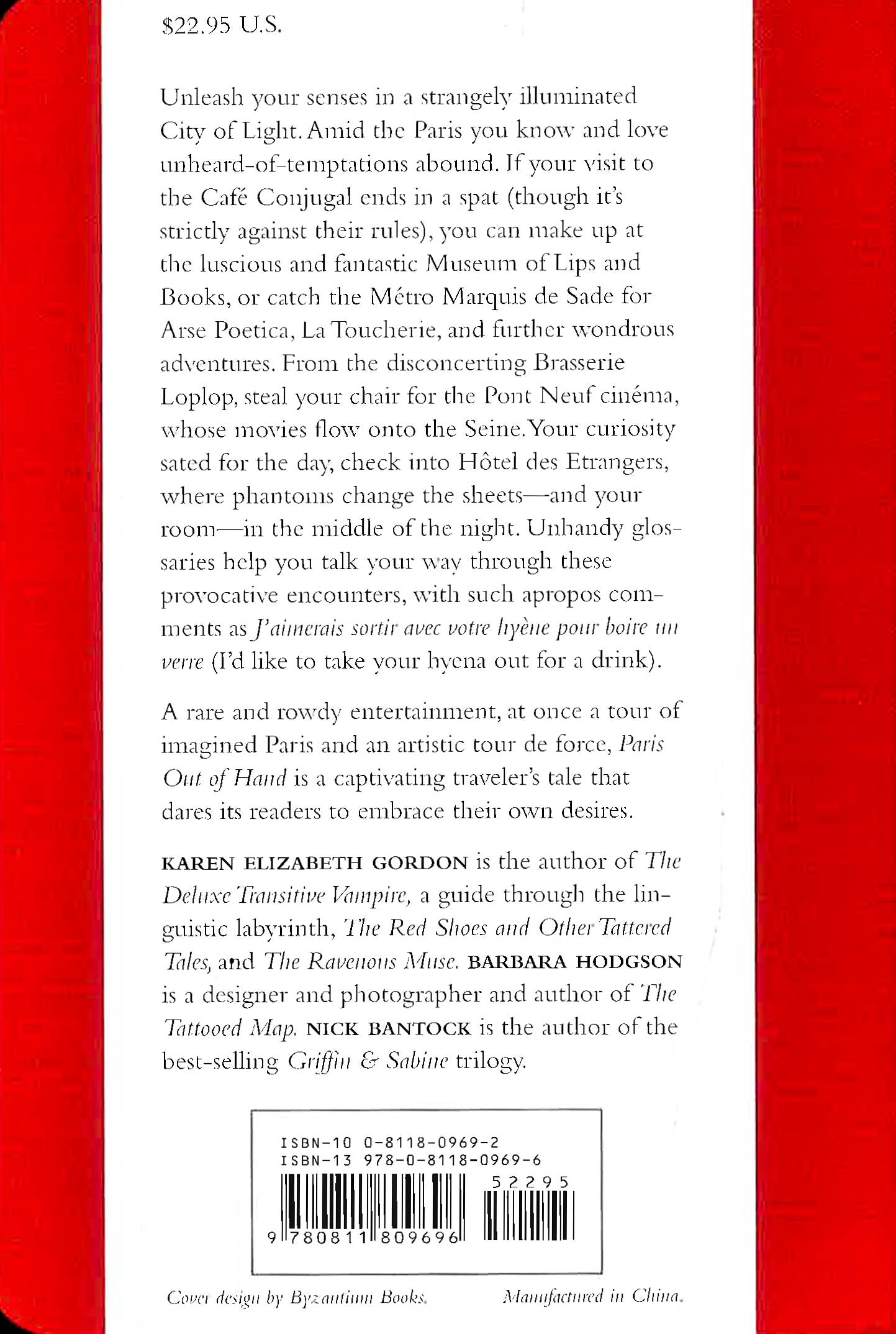From the author of The Transitive Vampire, comes an invitation to a strangely illuminated City of Light, Paris out of Hand. This seductively beautiful replica of a 19th-century travel bookreplete with illustrations of sights you will never see and maps that may plummet you into a different eraguides readers through the Paris that is, that might be, and that never was. Amid the Parisian locales you know and love, unheard-of temptations abound. If your visit to the Cafe Conjugal ends in a spat, you can make up at the luscious and fantastic Museum of Lips and Books. From the disconcerting Brasserie Loplop, steal your chair for the Cinema Pont Neuf, whose movies flow onto the Seine. Your curiosity sated for the day, check into Hotel des Etrangers, where phantoms change the sheets and your room in the middle of the night. Unhandy glossaries help you talk your way through these provocative encounters, with such apropos comments as J'aimerais sortir avec votre hyene pour boire un verre (I'd like to take your hyena out for a drink). A rare and rowdy entertainment that dares its readers to explore a Paris one can only wish existed.