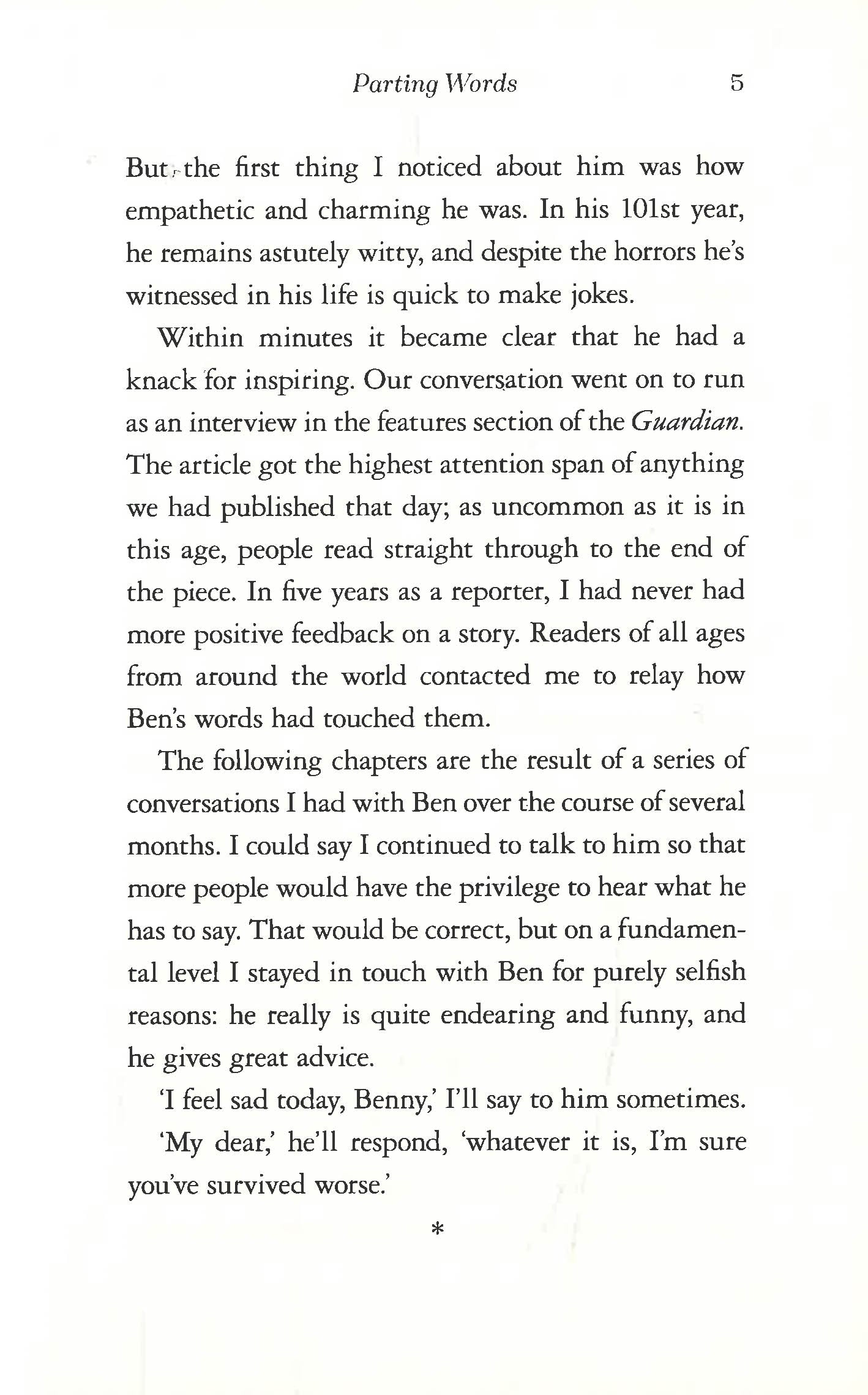 100-year-old Benjamin Ferencz is the last surviving prosecutor of the Nuremberg Trials, where he prosecuted 22 leading Nazis. PARTING WORDS follows the story of Ben's life, and each chapter includes his learnings on how we can all make the most of ours - from the subjects of ambition and determination, to happiness and love.