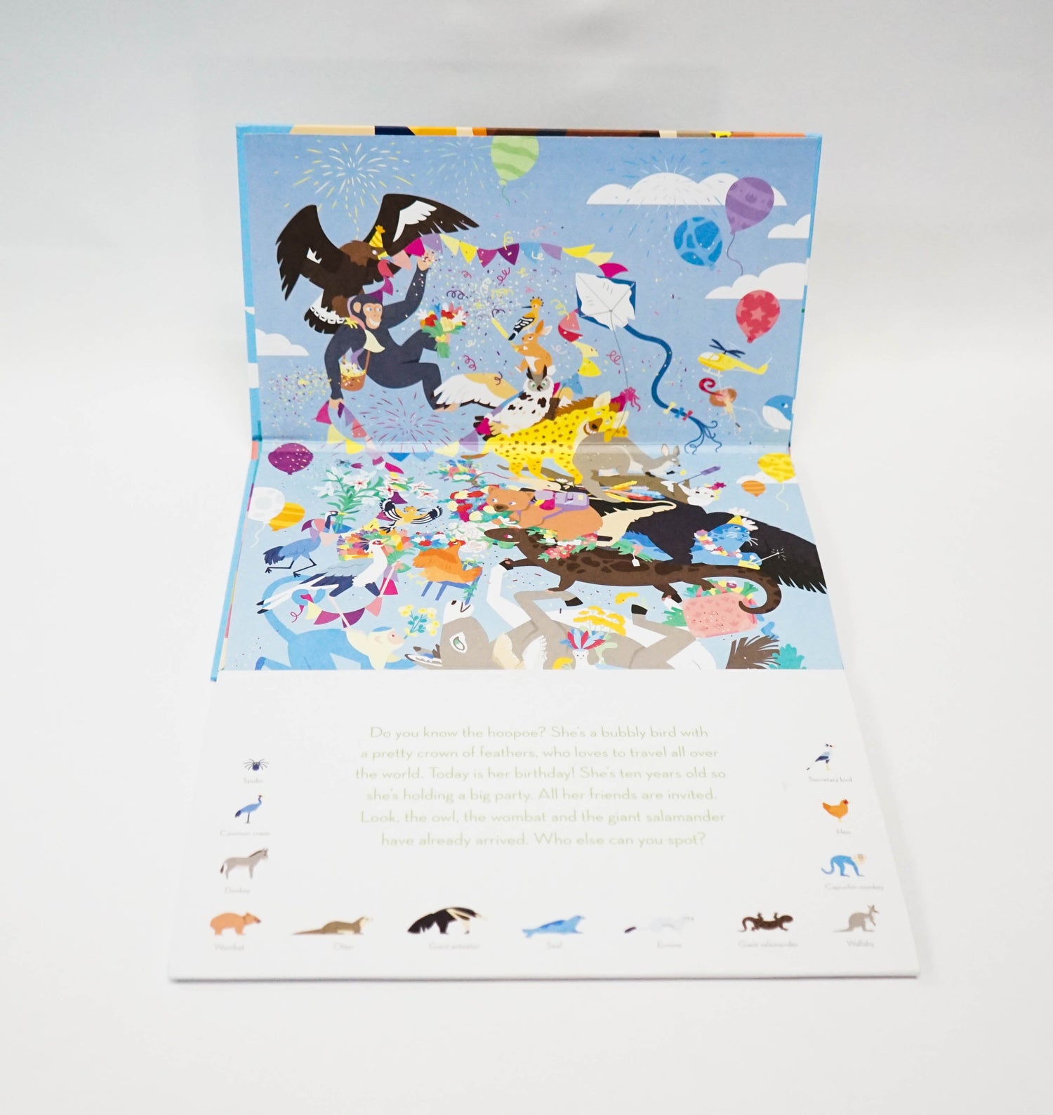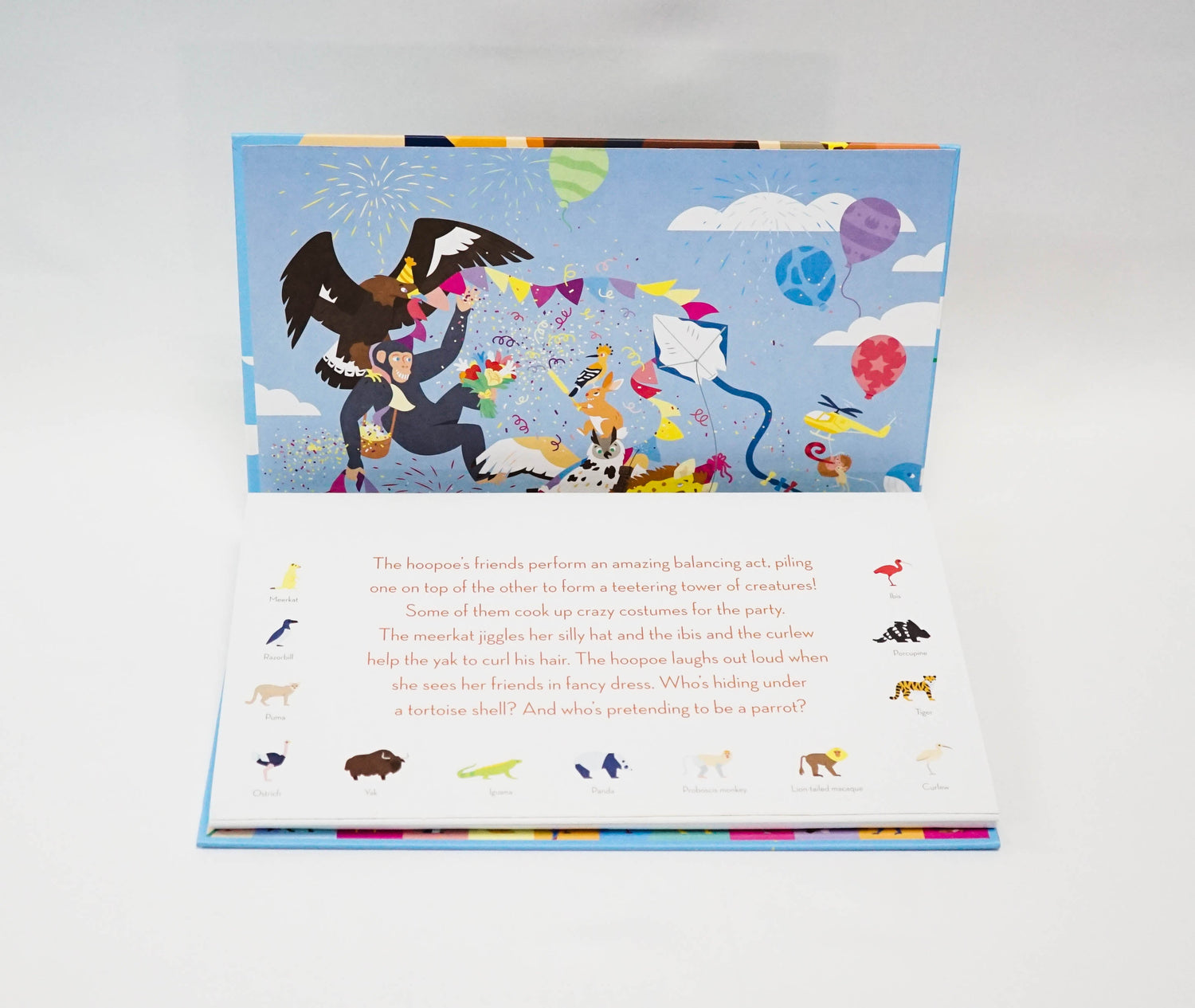 It's the hoopoe's birthday today, and all the animals have come together to prepare a great feast. Gathering for the fun is the gorilla, the cow, the bear, the camel, the crocodile, the giraffe, the boa, the rhino, the albatross, the kangaroo, the tapir, the panda, the tortoise, the wolf, the penguin and more... Together, they form a funny pyramid-shaped Noah's Ark. This spectacular, almost two-metre-long frieze encourages children to guess on each page the hidden animals on the floor below. Filled with fantastic and funny details, Party Animals! will provide hours of entertainment!