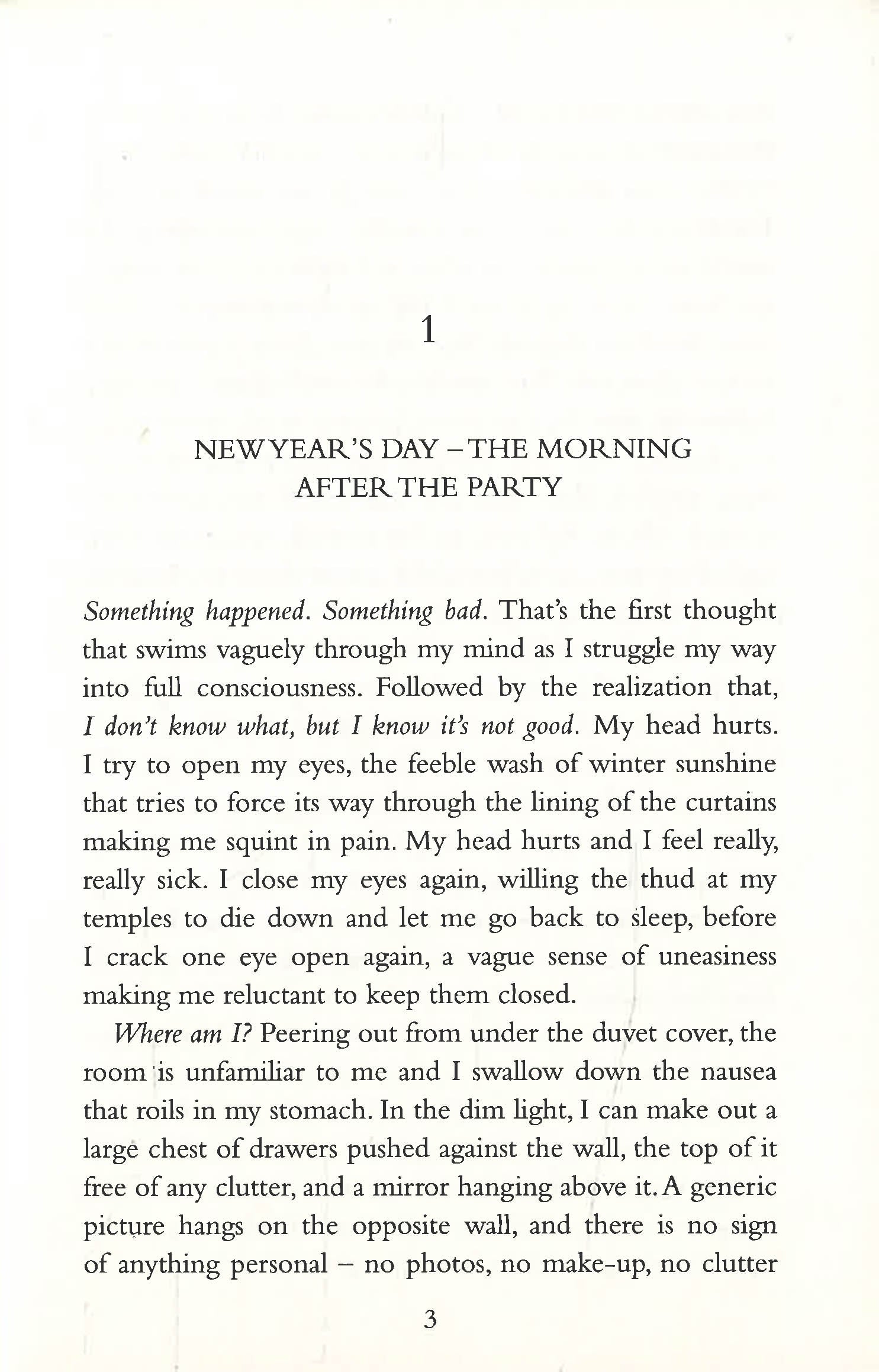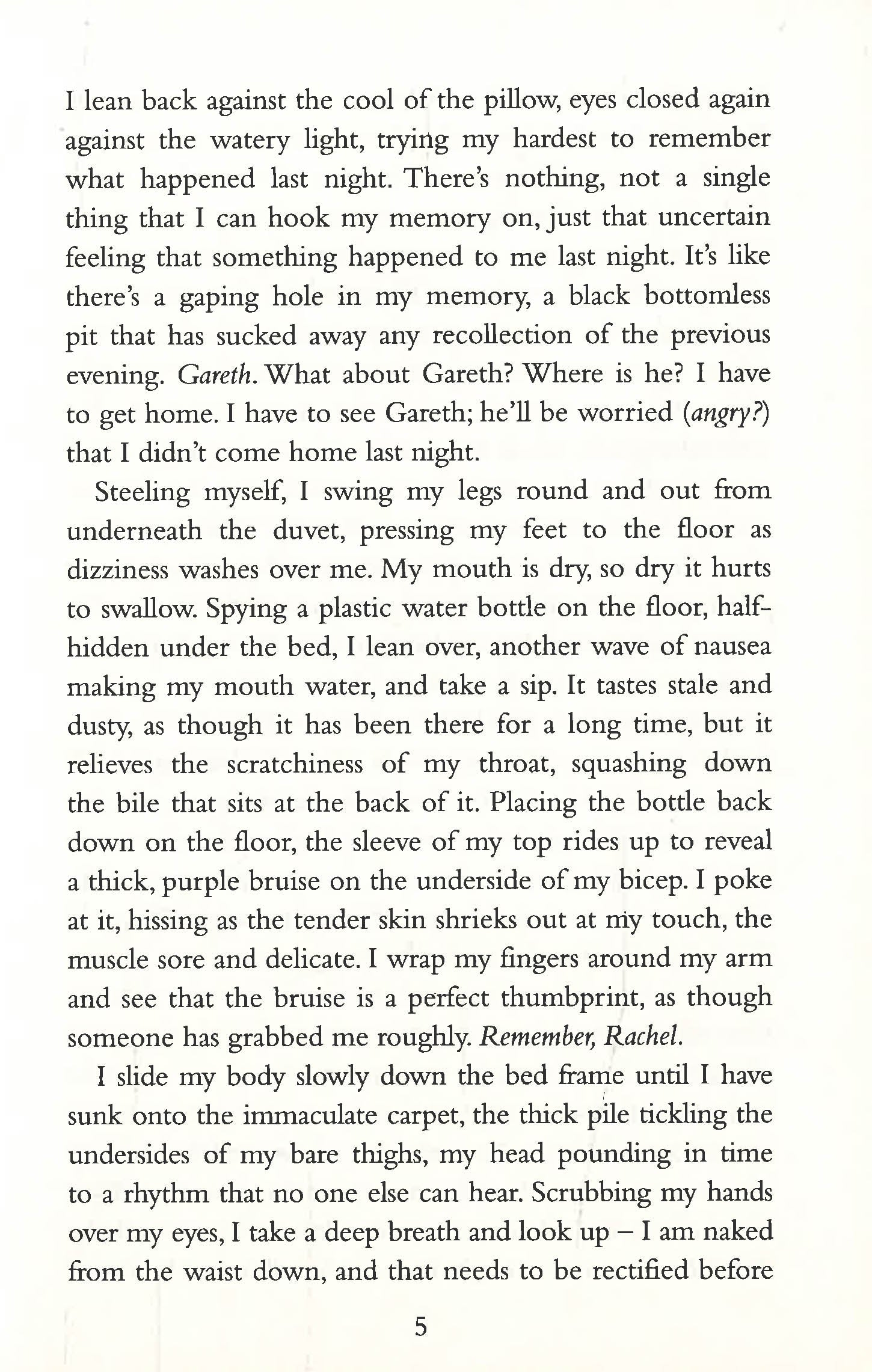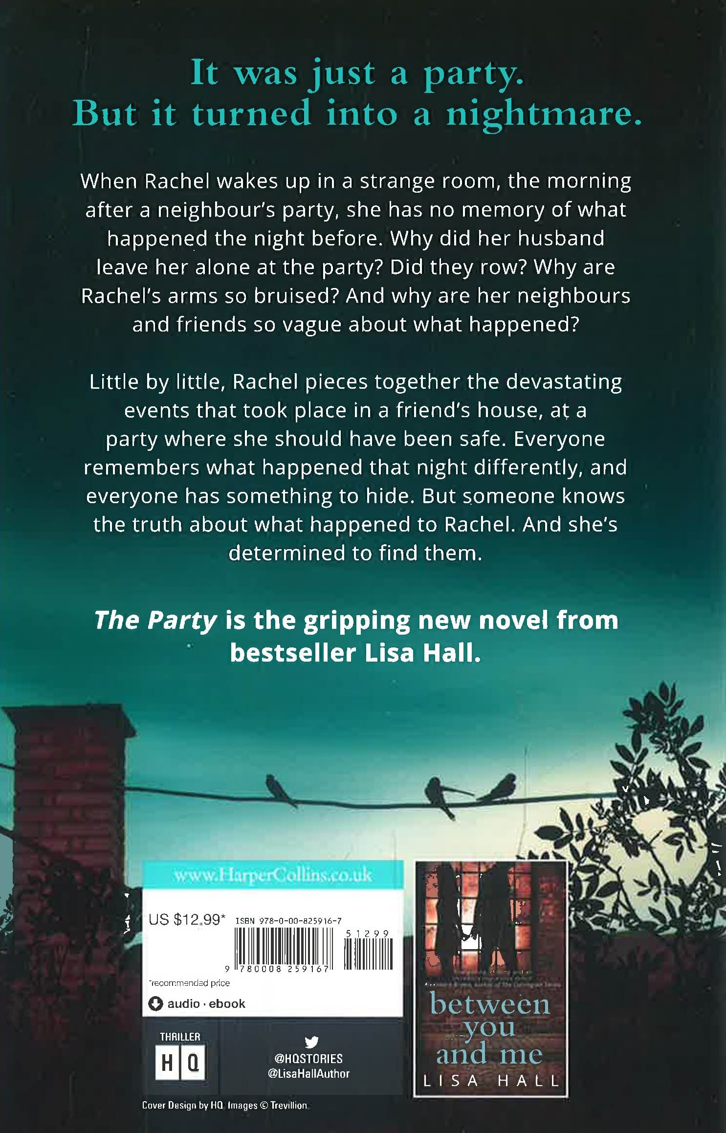 It was just a party. But it turned into a nightmare. When Rachel wakes up in a strange room, the morning after a neighbour's party, she has no memory of what happened the night before. Why did her husband leave her alone at the party? Did they row? Why are Rachel's arms so bruised? And why are her neighbours and friends so vague about what really happened? Little by little, Rachel pieces together the devastating events that took place in a friend's house, at a party where she should have been safe. Everyone remembers what happened that night differently, and everyone has something to hide. But someone knows the truth about what happened to Rachel. And she's determined to find them.
