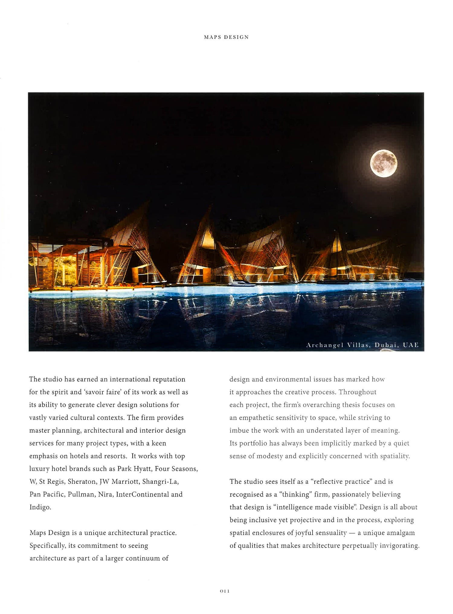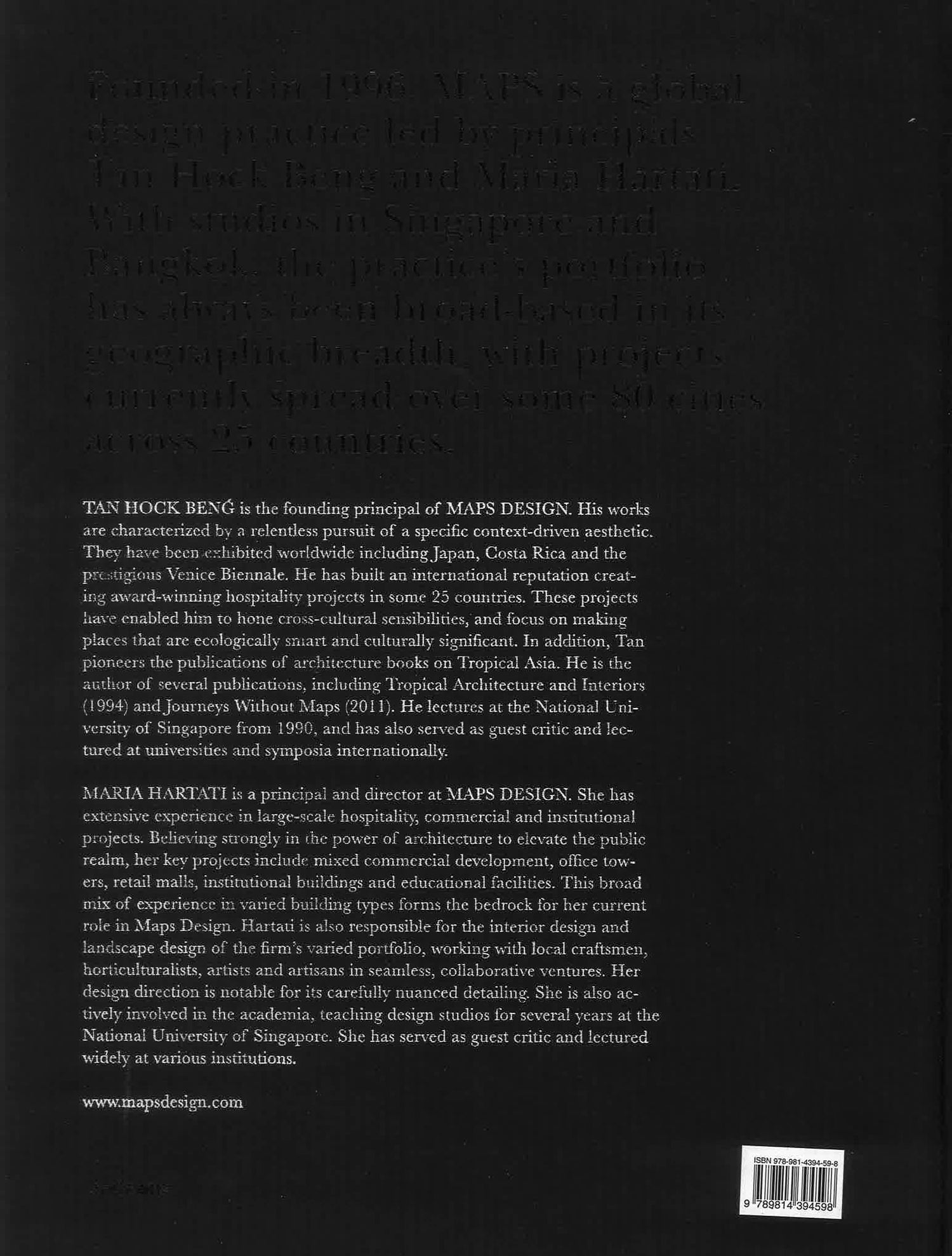 MAPS Design was founded in 1996 by principals Tan Hock Beng and Maria Hartati, becoming a global design practice with offices in Singapore and Bangkok. MAPS Design's portfolio has always been broad based in its geographic breadth. It has earned an international reputation for its ability to generate thought provoking design solutions for its discriminating clientele from vastly varied cultural contexts. The firm provides comprehensive architectural and interior design services for many project types, with a keen emphasis in hospitality design. It currently has about 25 high profile hospitality projects ranging from resorts to urban hotels under way in many parts of the world, including Singapore, Indonesia, Thailand, Vietnam, The Philippines, Taiwan, Tokyo, China, India, Middle East, Maldives, Seychelles, Spain, London and Hawaii. The firm works with luxury hotel brands like W, St Regis, Sheraton, Park Hyatt, JW Marriott, Intercontinental and Crowne Plaza. These projects have been widely published in various international journals and exhibited in different countries and venues including Tokyo, Costa Rica, and the prestigious Venice Biennale in Venice.