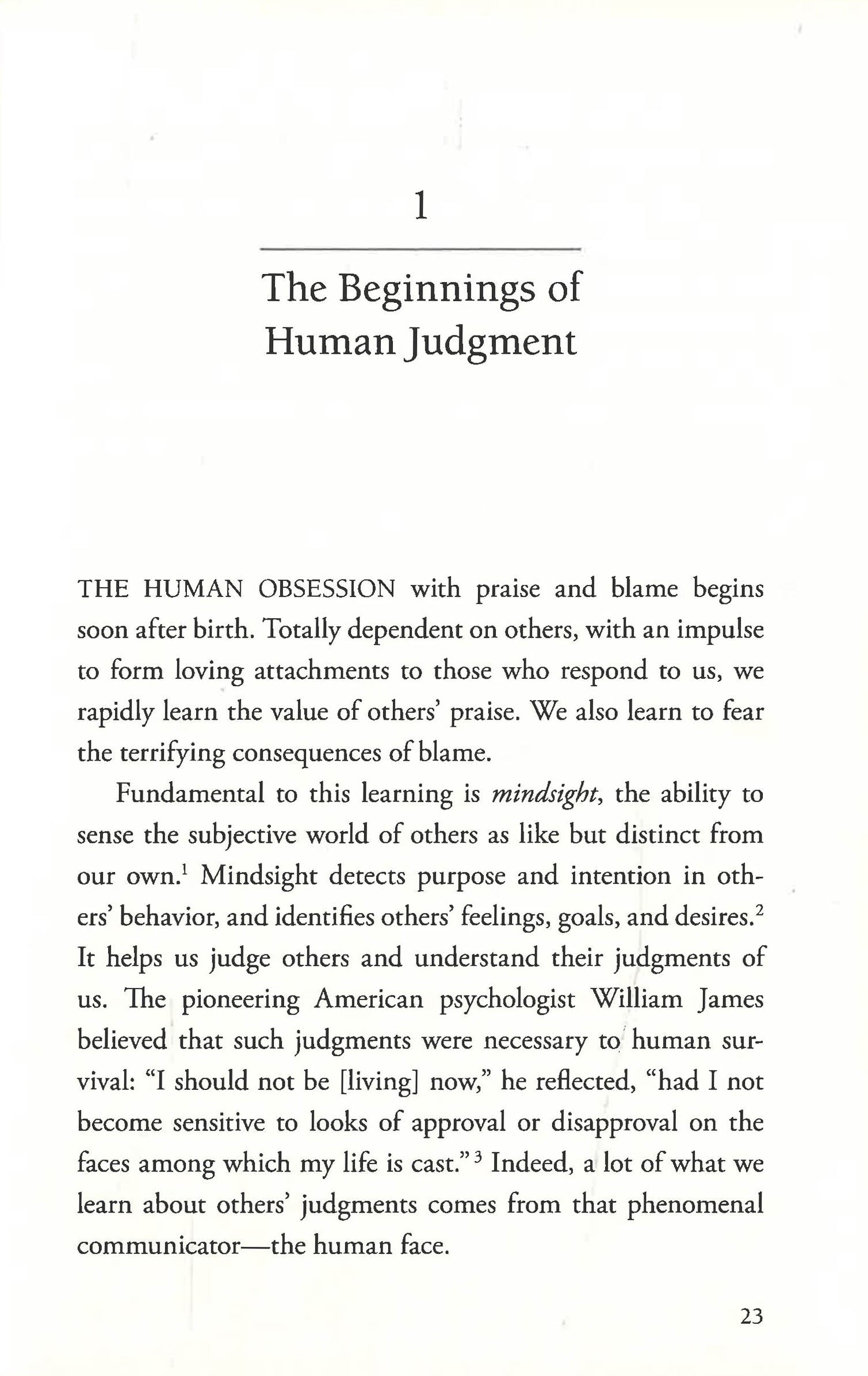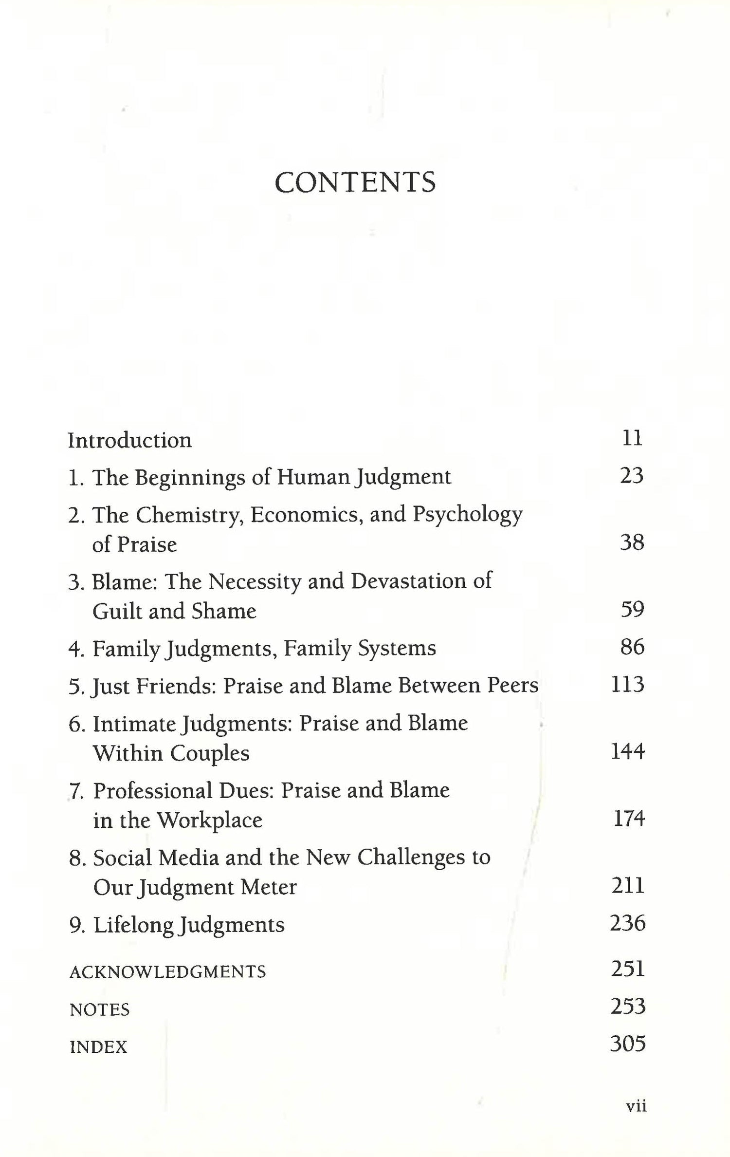 Our obsession with praise and blame begins soon after birth. Totally dependent on others, rapidly we learn to value praise and to fear the consequences of blame. Despite outgrowing an infant’s dependence, we continue to monitor others’ judgments of us―and develop what relational psychologist Terri Apter calls a “judgment meter”, which constantly scans people and our interactions with them, registering a positive or negative opinion.