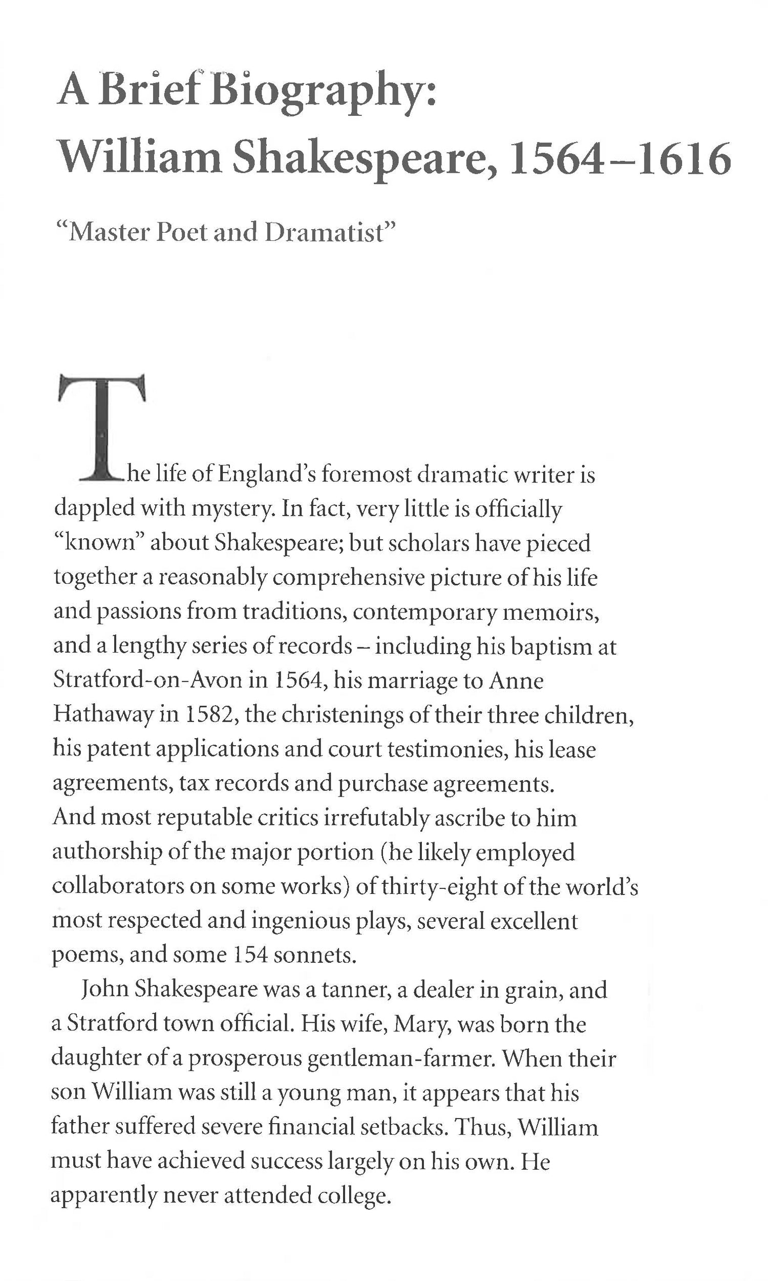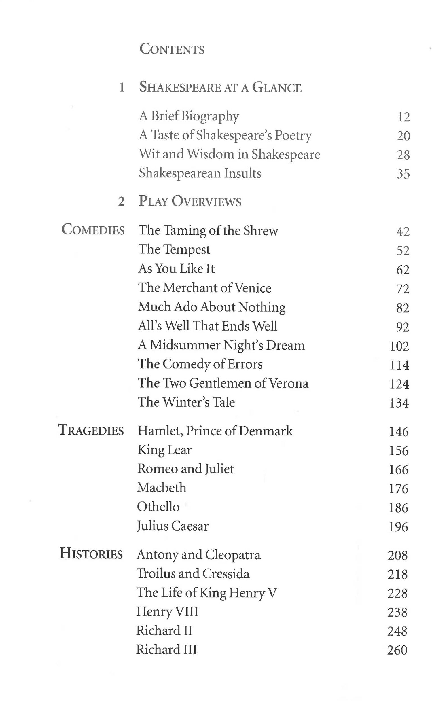 269 pages; abreviated versions of 22 Shakespearean plays, plus a brief biography of the playwright, a section of his most notable quotes, poetry, etc.