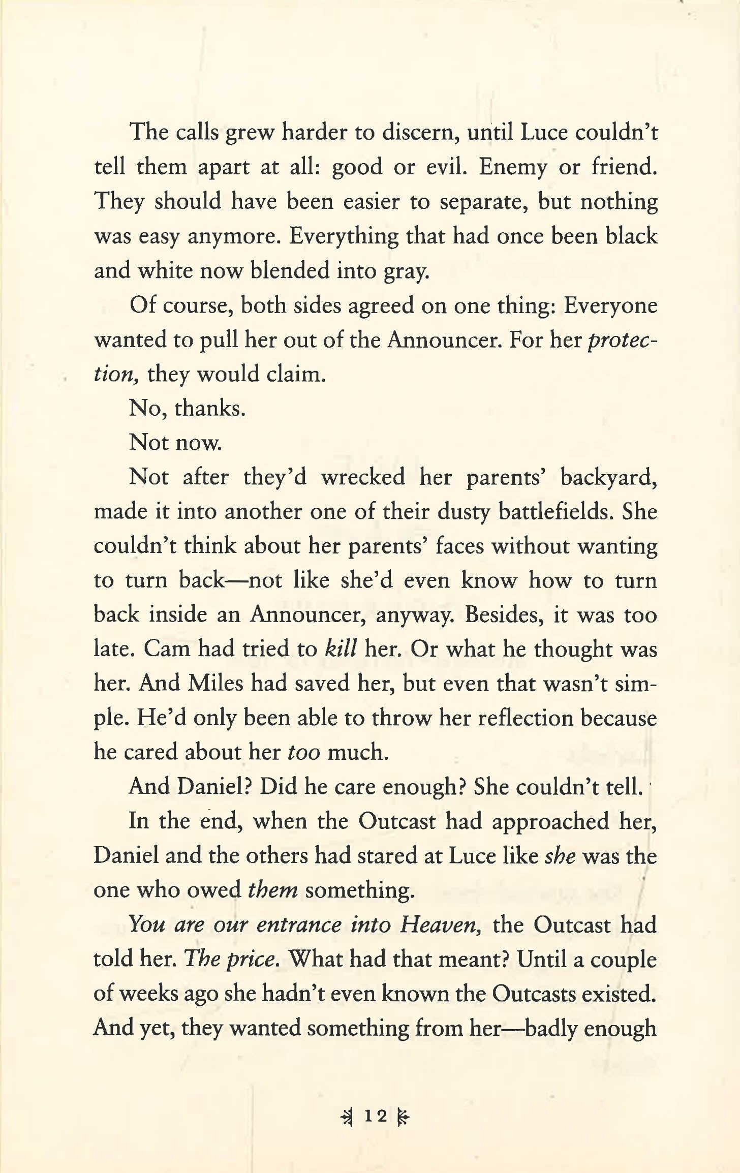 Cam and the legions of angels and Outcasts are desperate to catch Luce, but none are as frantic as Daniel. He chases Luce through their shared pasts, terrified of what might happen if she rewrites history.