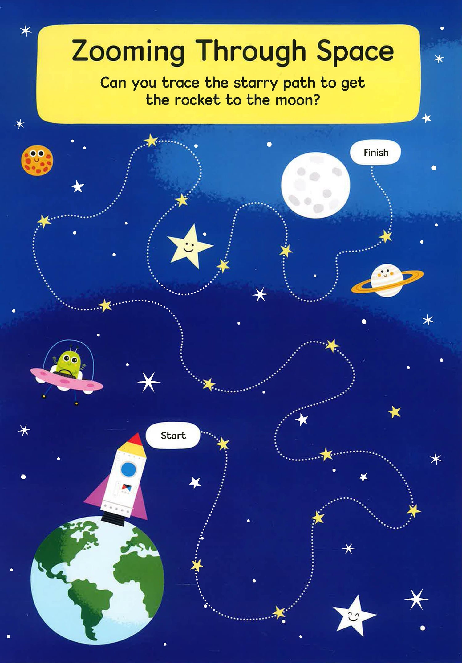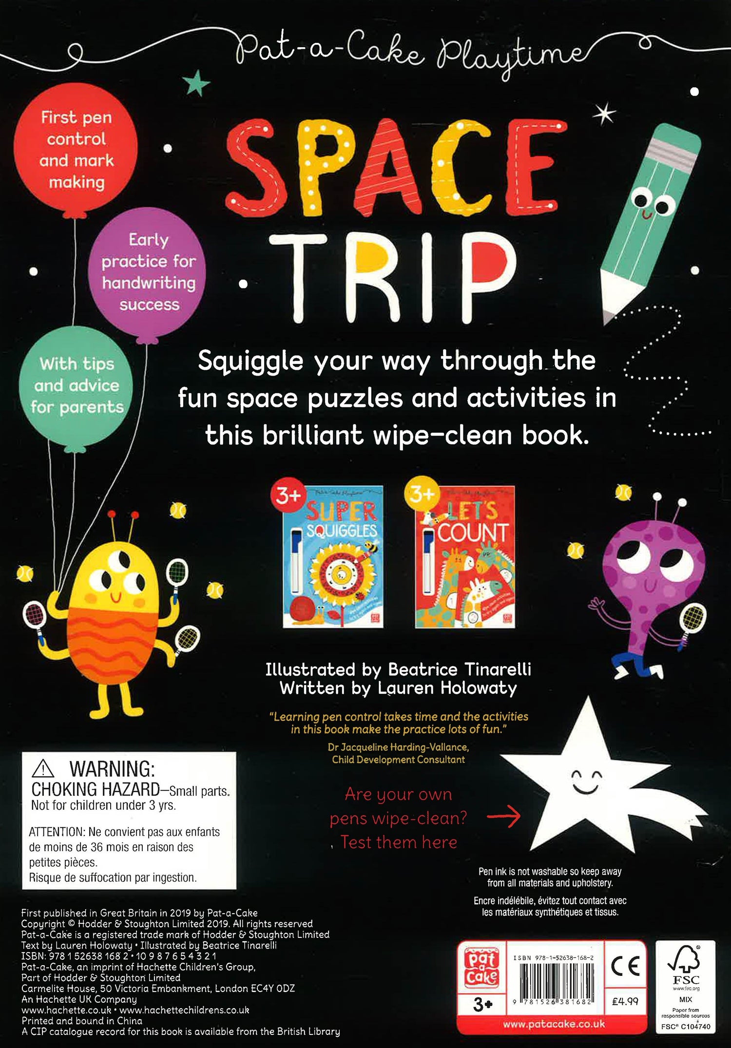 Essential, fun wipe-clean activity books to keep children busy and master key early learning skillsSpace Trip is packed with brilliant activities and puzzles that are simply out of this world! Children will love getting to grips with pen control and mark-making as they try all of the cosmic challenges over and over again using the wipe-clean pen.The consultant-approved activities are fun to do and are combined with brilliant, engaging art that children will love.Also available: Let's Count!, Super Squiggles