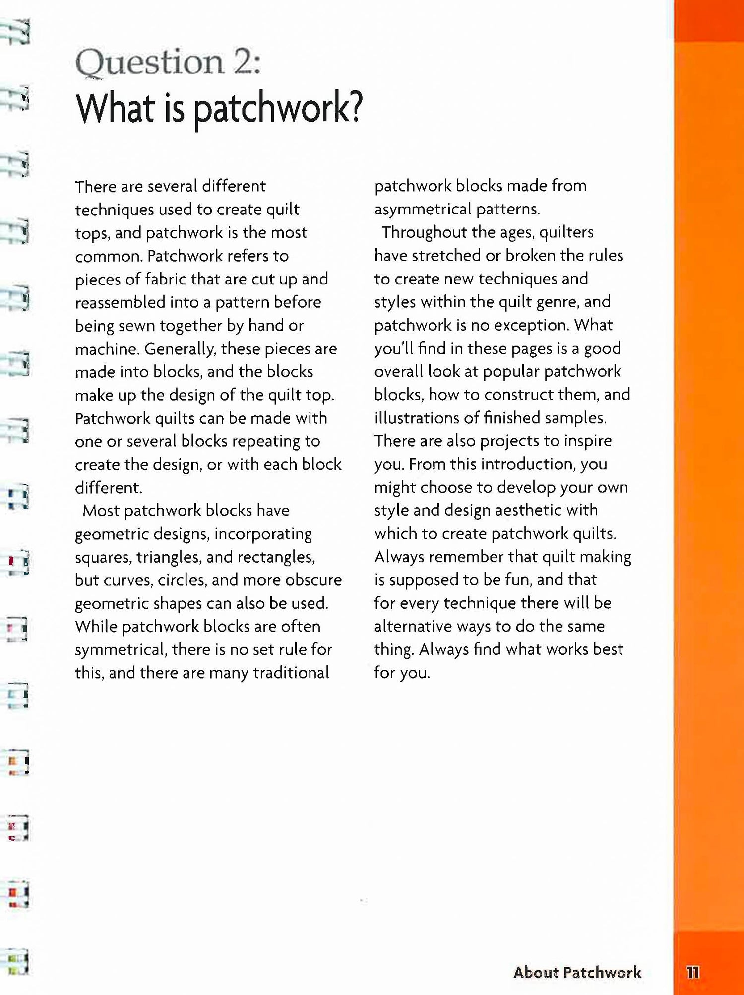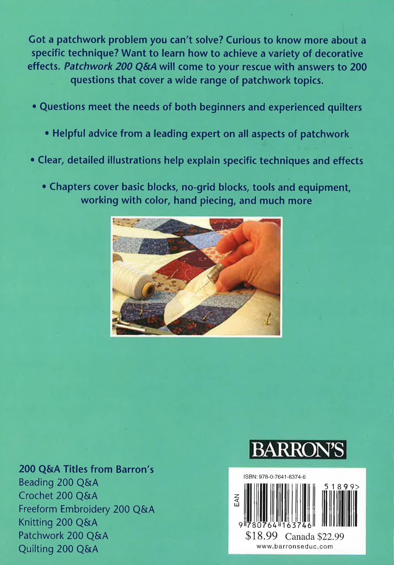Brand-new in Barron's growing "200 Q&A" series of books for craft hobbyists, this profusely illustrated volume uses the easy-reference Q&A format to answer needlecrafters' most-often-asked questions about mastering the required techniques for making a variety of patchwork items. Practical answers to 200 questions enlighten readers on-- The difference between a template and a stencil and how to use each The best fabric to use for a patchwork bag How to join irregular shapes to create crazy patchwork patterns How a home computer can help in creating patchwork designs How to make pictures with patchwork How to do appliqu . . . and much more Here, too, is information on needed tools and techniques, fabrics, making and joining blocks, matching colors, mixing plain and patterned pieces, fabric dying, and collage. The book's questions with answers are categorized according to themed chapters that cover everything from "Tools and Materials" to "Patchwork as Artwork. " Instruction is enhanced with approximately 100 illustrations in color and black and white.