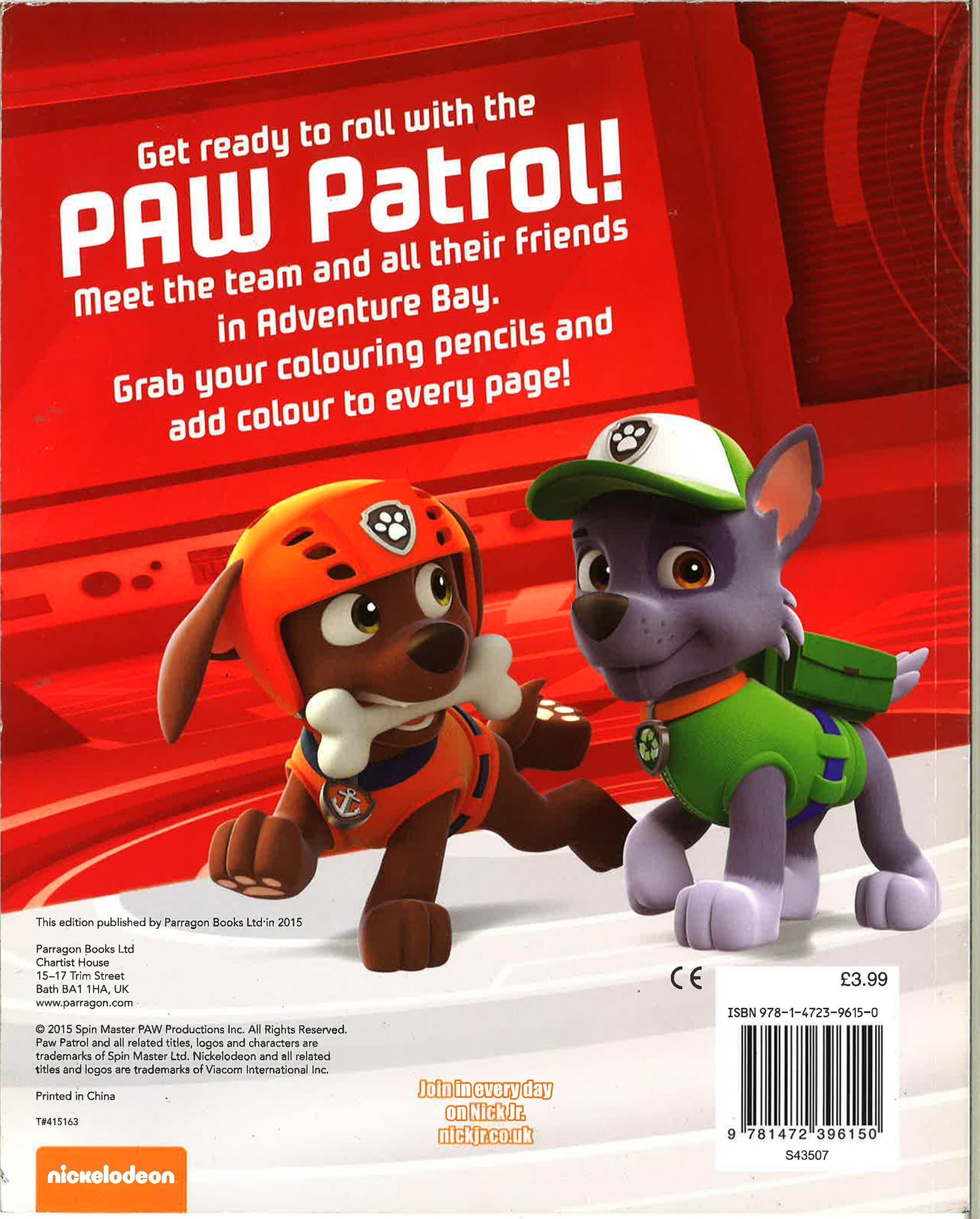 Join the PAW Patrol as they help out friends in need! Meet Marshall, Chase, Rocky and all their friends in Adventure Bay. Grab your colouring pencils and add colour to every paw-rific page!
