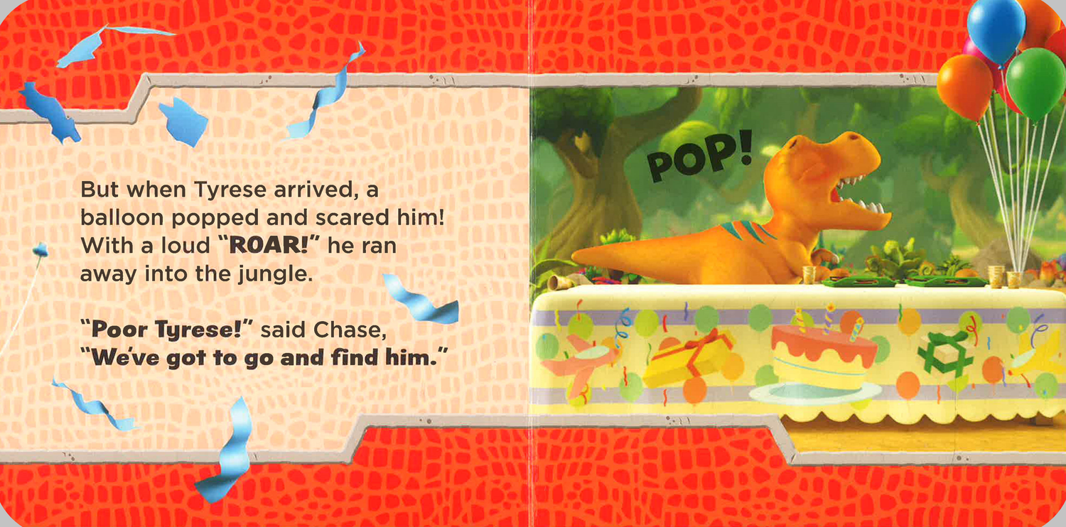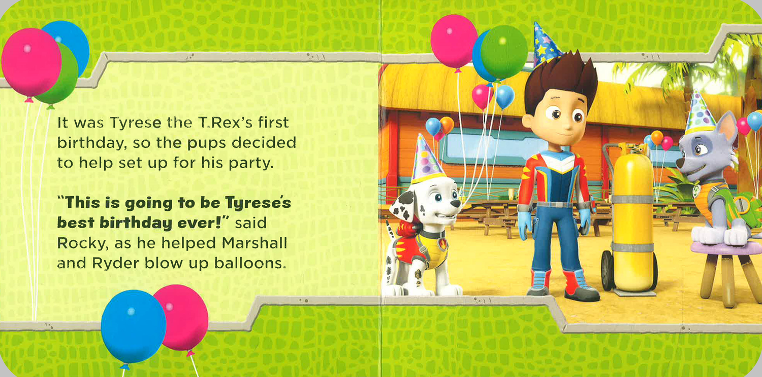 The pups are preparing for Tyrese the T-Rex’s first birthday, but a popping balloon scares him away!