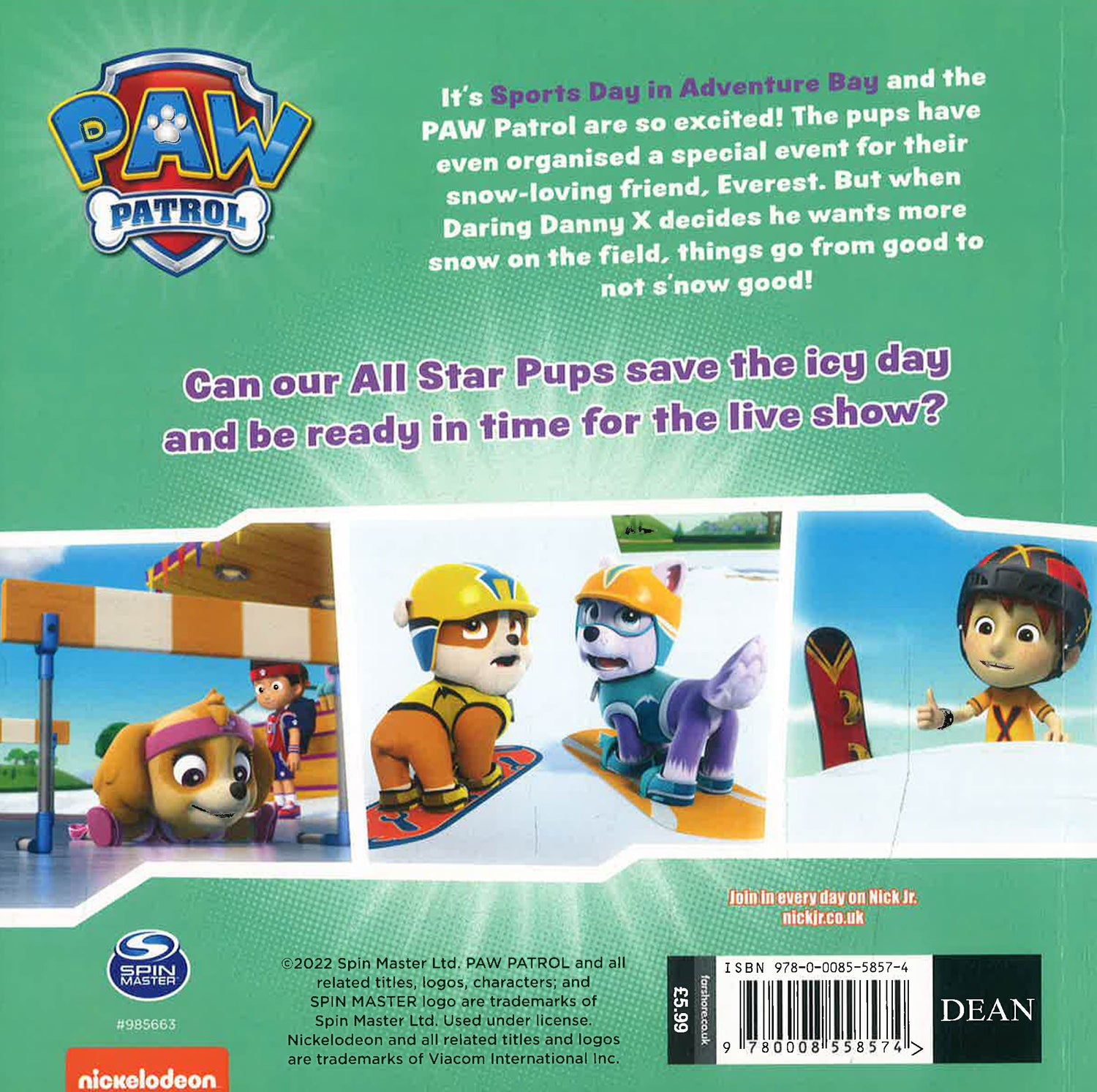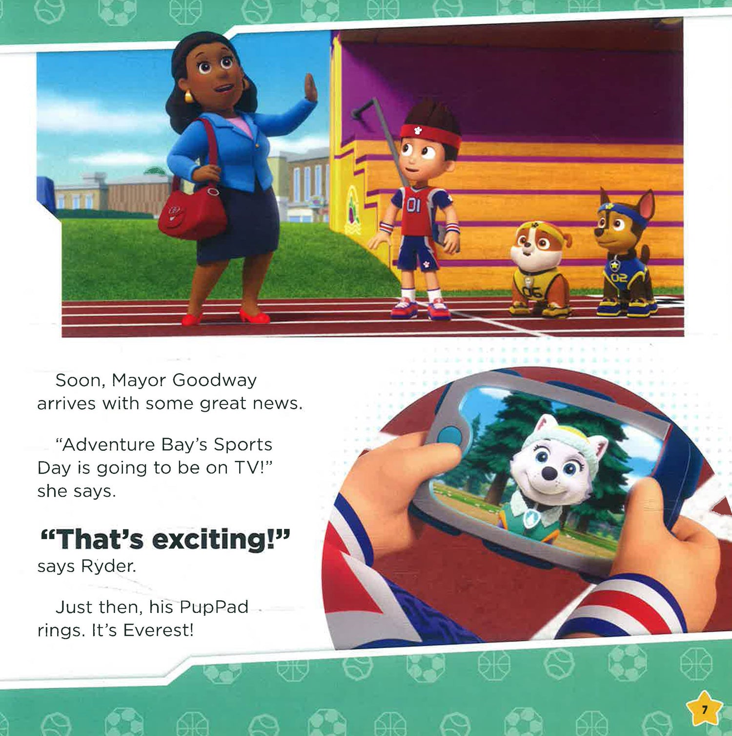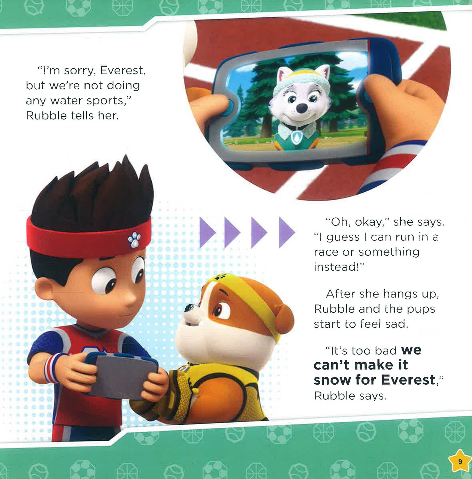At the track, the pups are busy practicing for the Sports Day Competition, with Rubble doing the hammer throw, Chase the long jump, Skye the hurdles, Rocky the high jump, and Zuma the discus throw, with Marshall and the rest of the pups being a part of the baton relay.