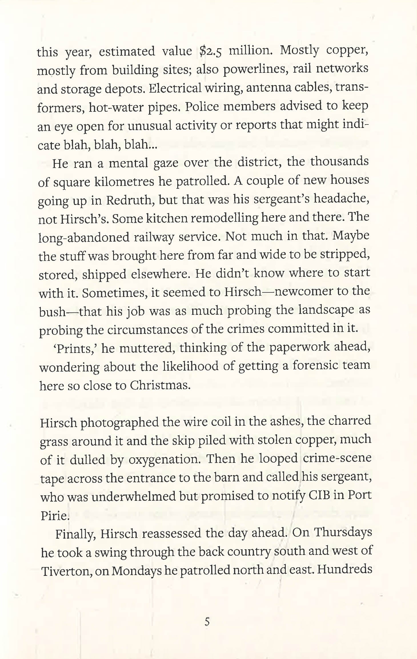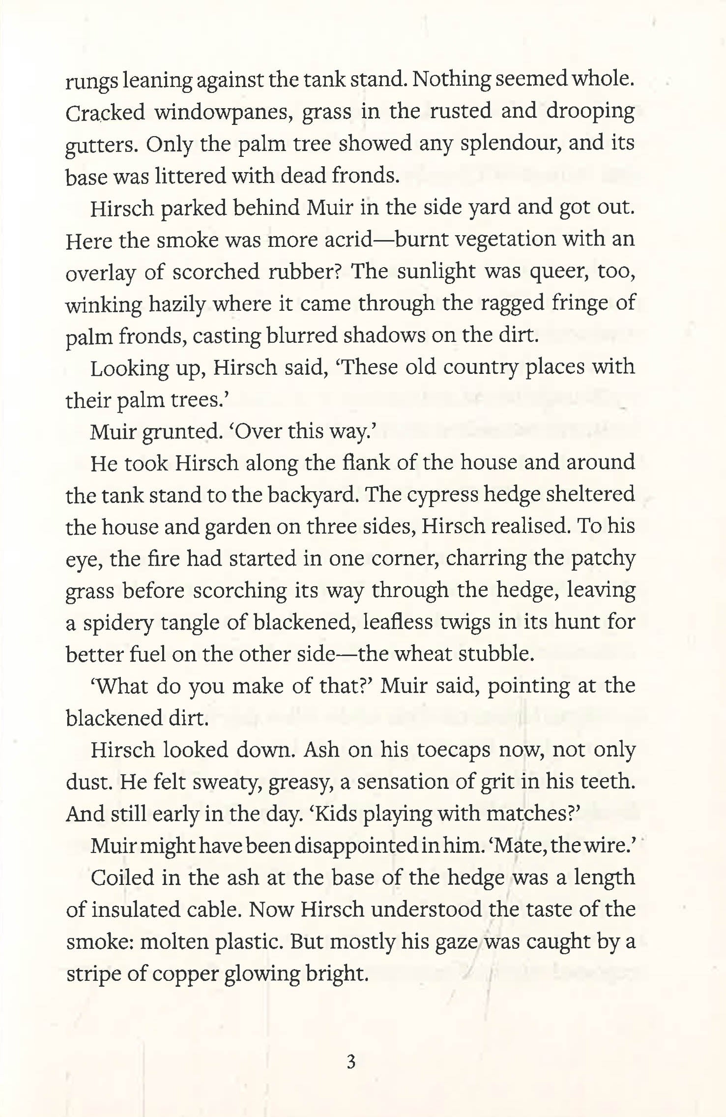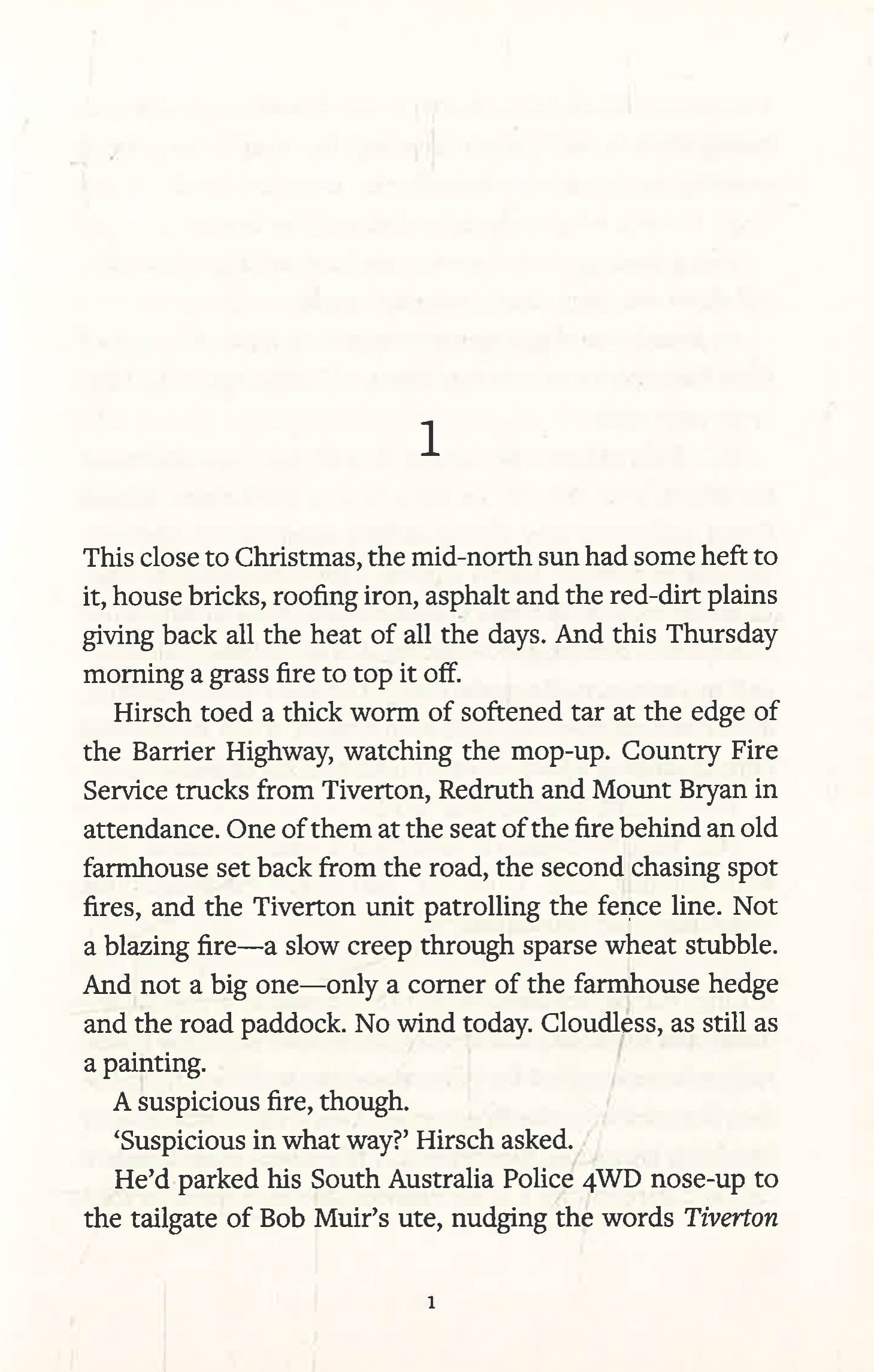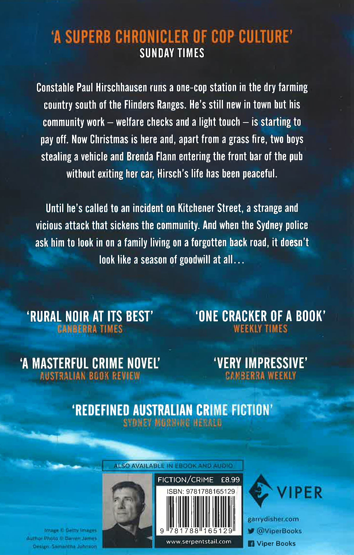 AN ACT OF INEXPLICABLE CRUELTY. A FAMILY DESTROYED. Constable Paul Hirschhausen runs a one-cop station in the dry farming country south of the Flinders Ranges. He's still new in town but his community work - welfare checks and a light touch - is starting to pay off. Now Christmas is here and, apart from a grass fire, two boys stealing a vehicle, and Brenda Flann entering the front bar of the pub without exiting her car, Hirsch's life has been peaceful. Until he's called to an incident on Kitchener Street, a strange and vicious attack that sickens the community. And when the Sydney police ask him to look in on a family living on a forgotten back road, it doesn't look like a season of goodwill at all... A hugely atmospheric police procedural set in the dust of the Australian outback. Perfect for readers of Jane Harper, Chris Hammer and Dervla McTiernan