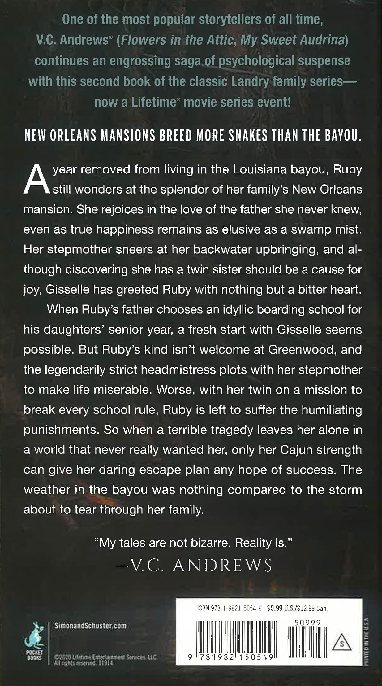 One of the most popular storytellers of all time, V.C. Andrews (Flowers in the Attic, My Sweet Audrina) continues an engrossing saga of psychological suspense with this second book of the Landry Family series—soon to be a Lifetime movie! Fate has whisked Ruby away from a simple life in the Louisiana Bayou but her new riches bring more treachery than happiness in this unputdownable and darkly evocative novel.