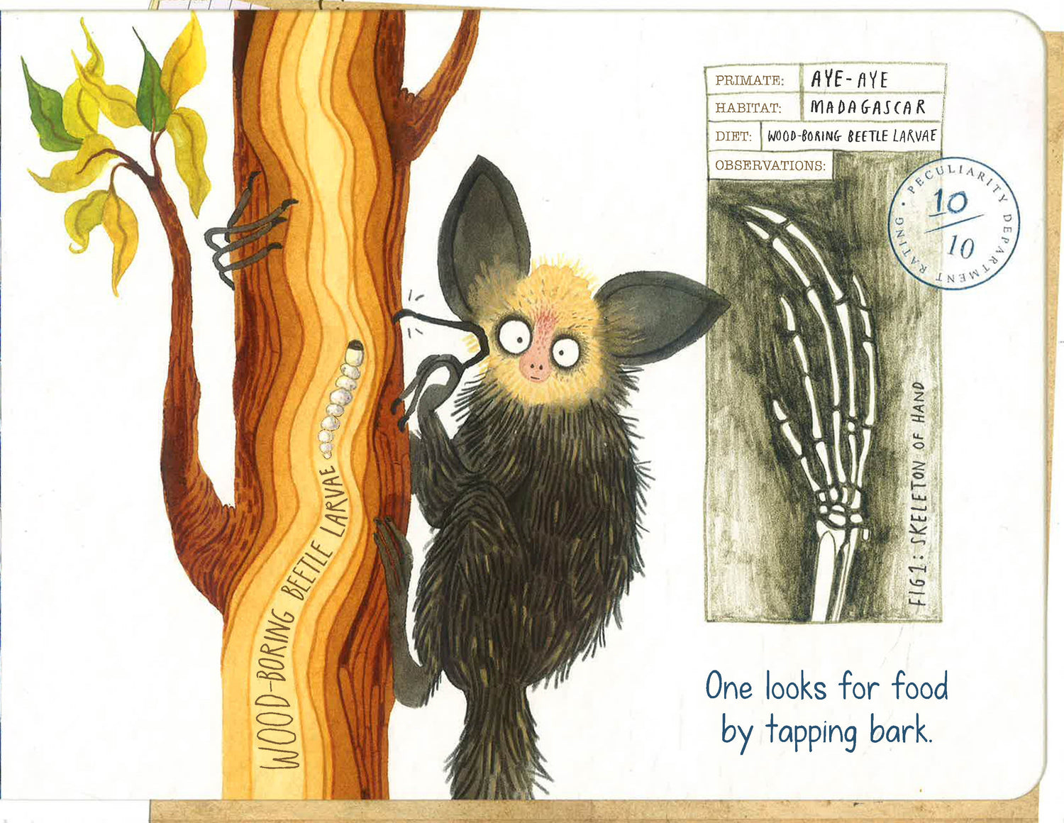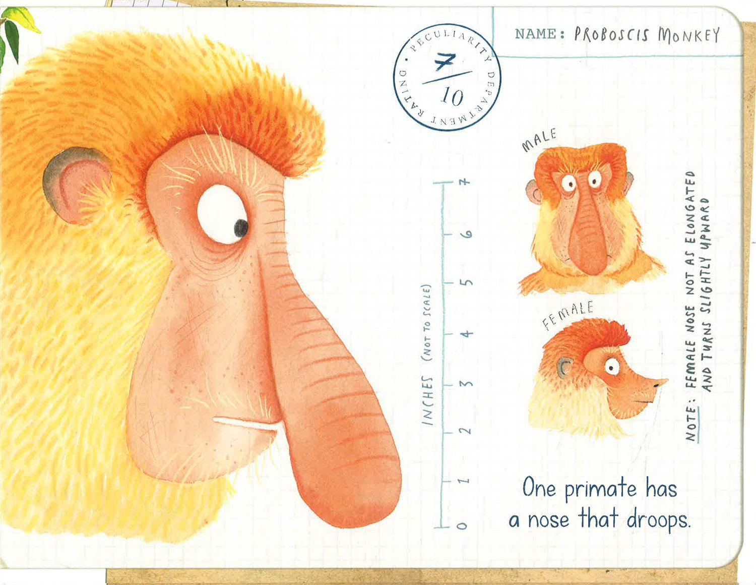 From flossing and howling, to building nests and thumping chests, this delightful follow up to Freaky, Funky Fish explores the amazing things primates do. All primates climb and breathe in air. They have big brains and hands and hair. But. . . some live alone, some live in groups. One primate has a nose that droops. Peculiar Primates is an adorable picture book with a scientific―and child-friendly―underpinning. With examples of different primates for each description, as well as extensive backmatter explaining the fascinating science behind their behaviors, this bizarre book captures the wonders of our ecosystem.