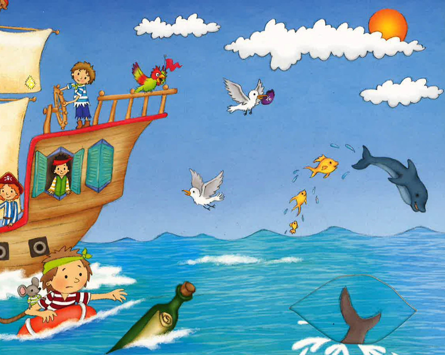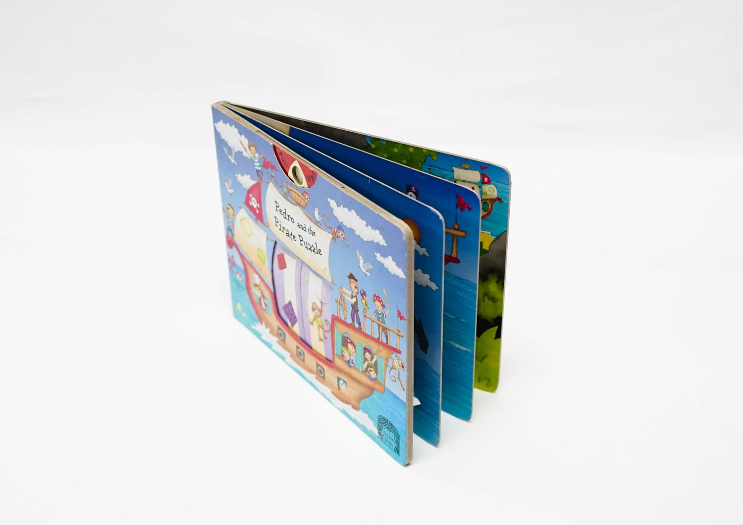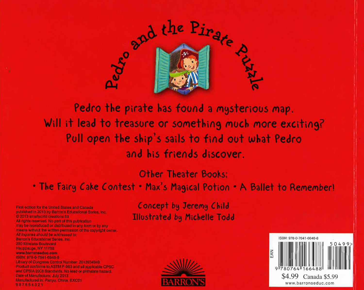 This interactive board book, from Barron's new "Theater Books" series, is all about drama! In "Pedro and the Pirate Puzzle," Pedro and his pirate friends have discovered a treasure map! Young readers can pull the tab to draw back the ship's sails and go on a treasure hunt. Each page features a cutout for a glimpse into the next scene.