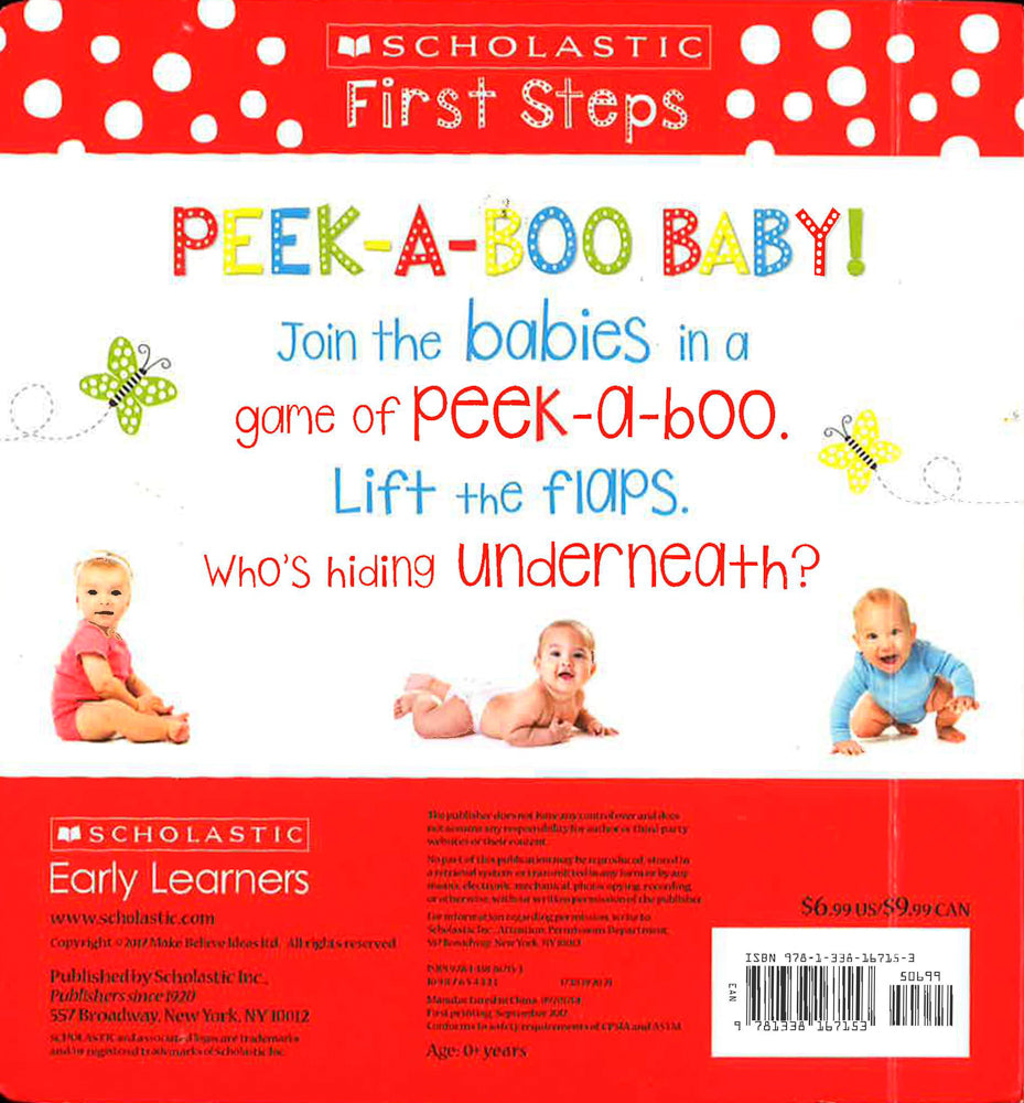 In Peek-a-Boo! Baby!, vivid photography of adorable baby faces matched with large lift-the-flaps make for an engaging first book that's tons of fun for babies and their parents!Part of a new baby faces line, these sturdy, small board books are just right for curious little ones fascinated by other babies. By turning the page and lifting the sturdy flaps, babies can observe the faces of a range of different children as they play a game of peek-a-boo! There are bright pictures and simple labels throughout the book, which teaches emotions and other first words while reinforcing children's awareness of the expressive faces around them.With rounded corners, irresistible lift-the-flaps, and bouncy rhyming text, this lightweight book is easy to handle and promotes language development and develops hand-eye coordination.Scholastic Early Learners: Interactive books for hands-on learning. Perfect for babies, toddlers, preschoolers, kindergarteners, and first graders.