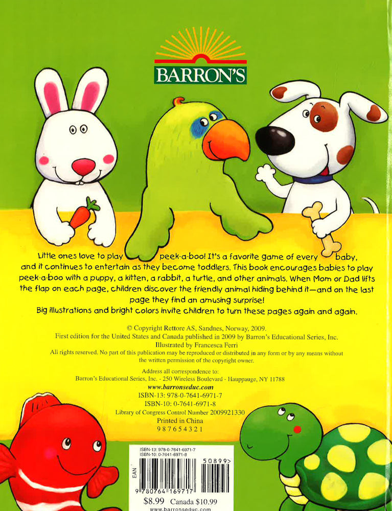 Peek-a-boo is the first game that babies learn, and this charming lift-the-flap book encourages Mom, Dad, and Baby to play peek-a-boo with favorite family pets. A little dog, a kitten, and other pets hide their eyes in large, cheerful color illustrations that appear on every page. But lift the flaps, and the animals' friendly faces come into view. On the very last page, Baby sees his or her own face reflected in a non-breakable mirror. This first book for Baby is also available in a Spanish language edition, titled Cucu--!Te veo! Mascotas.