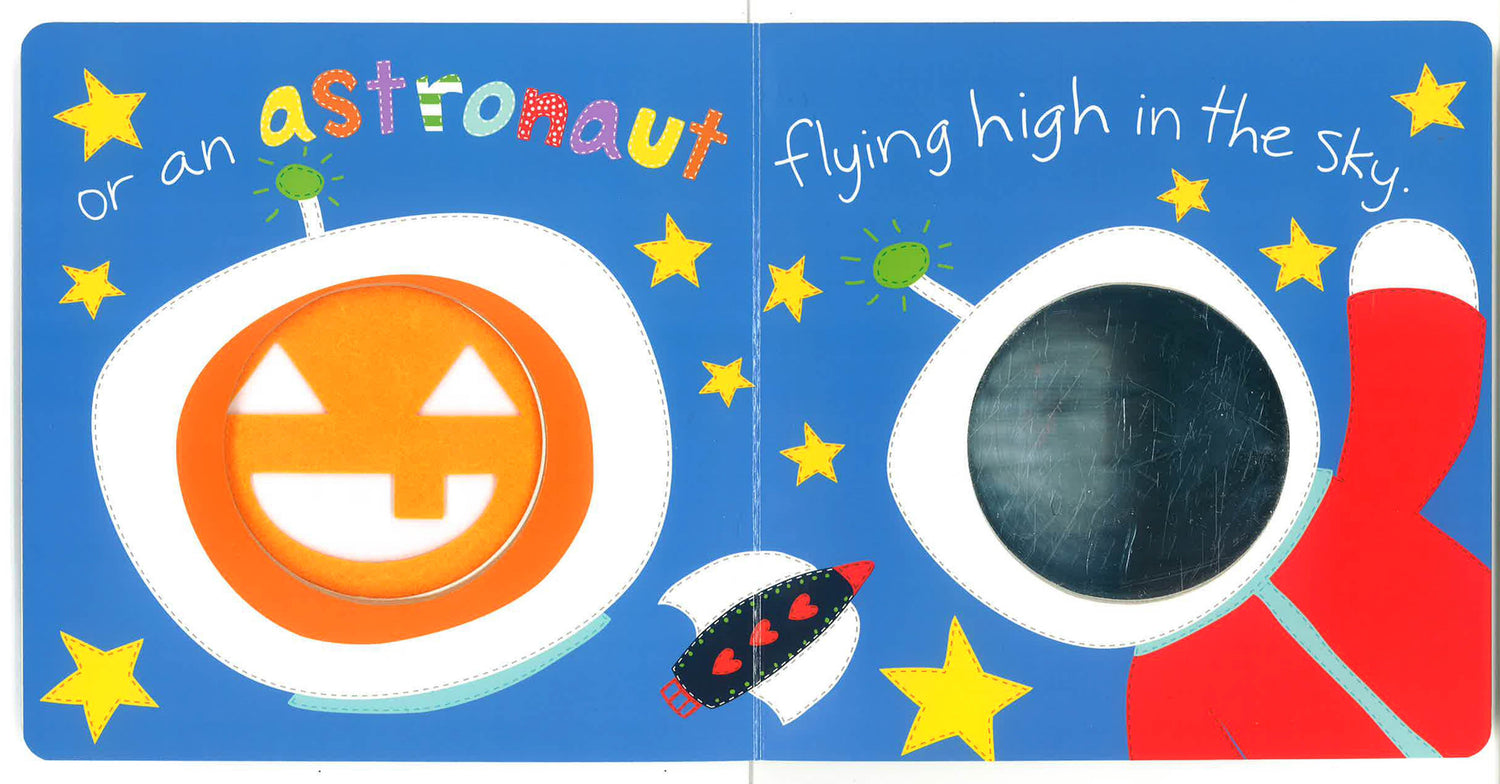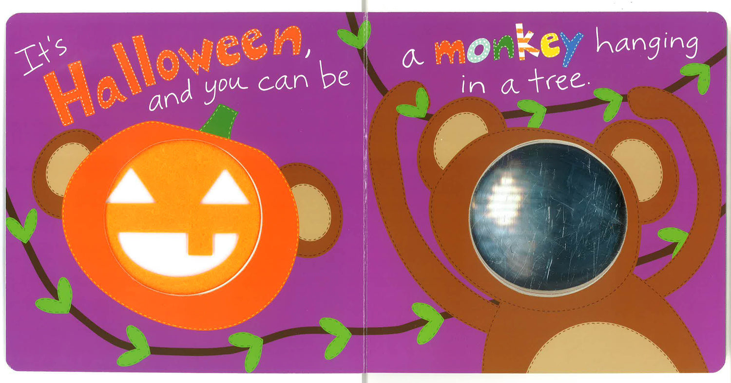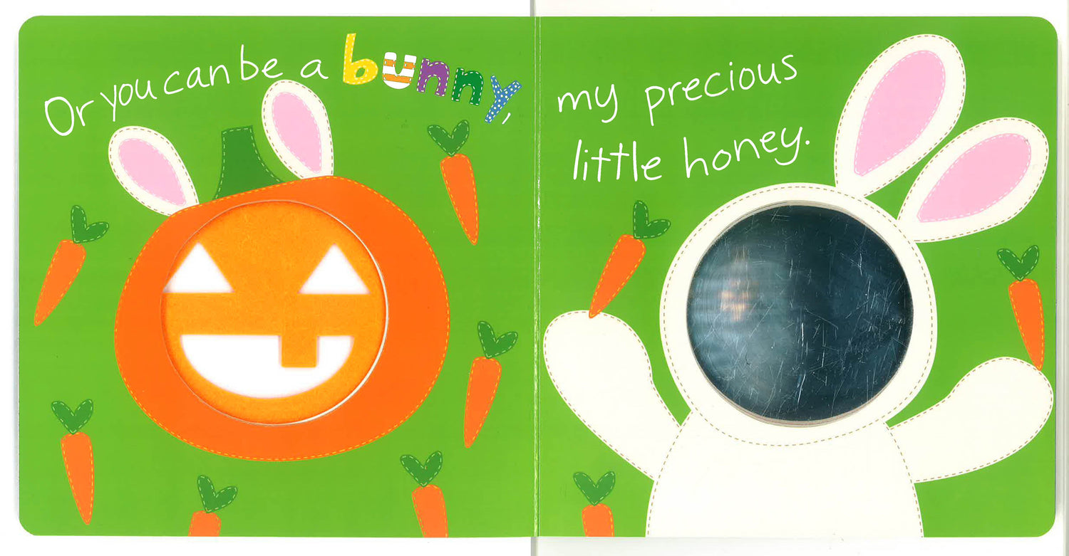 An innovative new Halloween treat from Sandra Magsamen with a die-cut felt jack-o'-lantern on the cover and a shiny mirror throughout, inviting little ones to dress up on every page! It's Halloween and you can be a monkey hanging in a tree. Or you can be a bunny my precious little honey. Little ones will love this adorable new Halloween novelty book from the bestselling baby and toddler brand creator, Sandra Magsamen. They will adore the die-cut felt pumpkin on the front cover, and the peek-through mirror on every page is sure to entertain as they try on a wide variety of costumes and ultimately discover who is loved most of all! A perfect book for cuddling up with your little pumpkin and celebrating the Halloween season.
