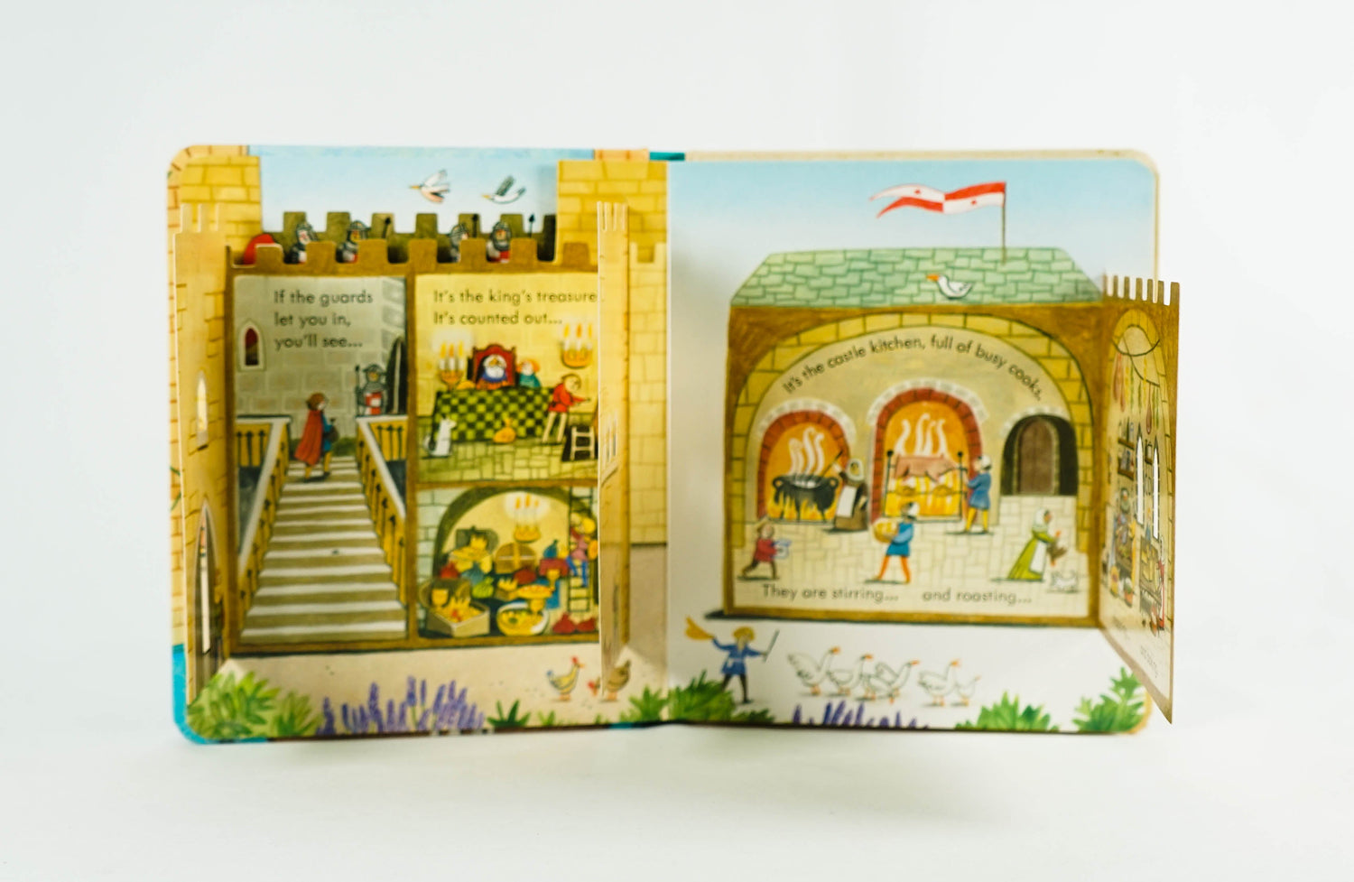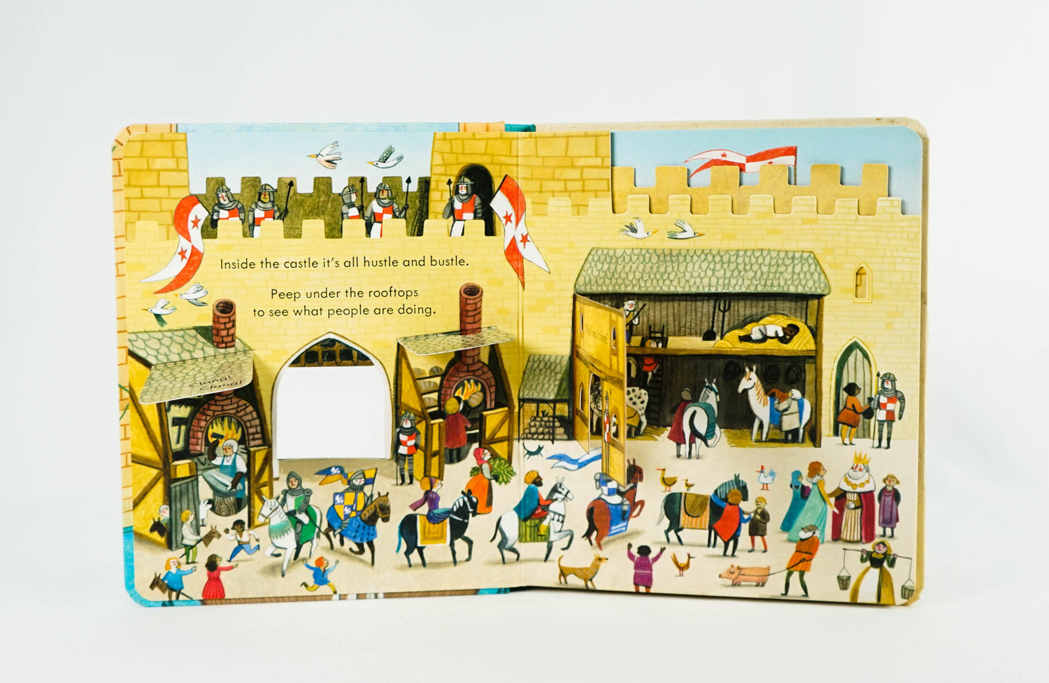 Young children can explore a bustling medieval castle in this charming, lift-the-flap non-fiction book. Flaps and peep-through holes in the pages reveal a knight putting on his armour, castle guards counting the king's treasure and a grand feast with the royal family. A lovely introduction to a popular historical subject for little children.