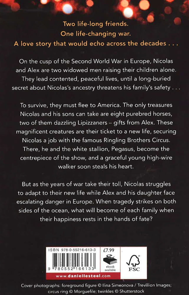 There, he and the white stallion, Pegasus, become the centrepiece of the show, and a graceful young high-wire walker soon steals his heart.But as the years of war take their toll, Nicolas struggles to adapt to their new life while Alex and his daughter face escalating danger in Europe.One life-changing war. A love story that would echo across the decades...On the cusp of the Second World War in Europe, Nicolas and Alex are two widowed men raising their children alone. They lead contented, peaceful lives, until a long-buried secret about Nicolas's ancestry threatens his family's safety...To survive, they must flee to America. The only treasures Nicolas and his sons can take are eight purebred horses, two of them dazzling Lipizzaners - gifts from Alex. These magnificent creatures are their ticket to a new life, securing Nicolas a job with the famous Ringling Brothers Circus. There, he and the white stallion, Pegasus, become the centrepiece of the show, and a graceful young high-wire walker soon steals his heart.But as the years of war take their toll, Nicolas struggles to adapt to their new life while Alex and his daughter face escalating danger in Europe. When tragedy strikes on both sides of the ocean, what will become of each family when their happiness rests in the hands of fate?A beautiful story of fate, love and loss, tied together by two families who were never meant to stay apart and the powerful bond that will link them forever, from the incomparable storyteller Danielle Steel
