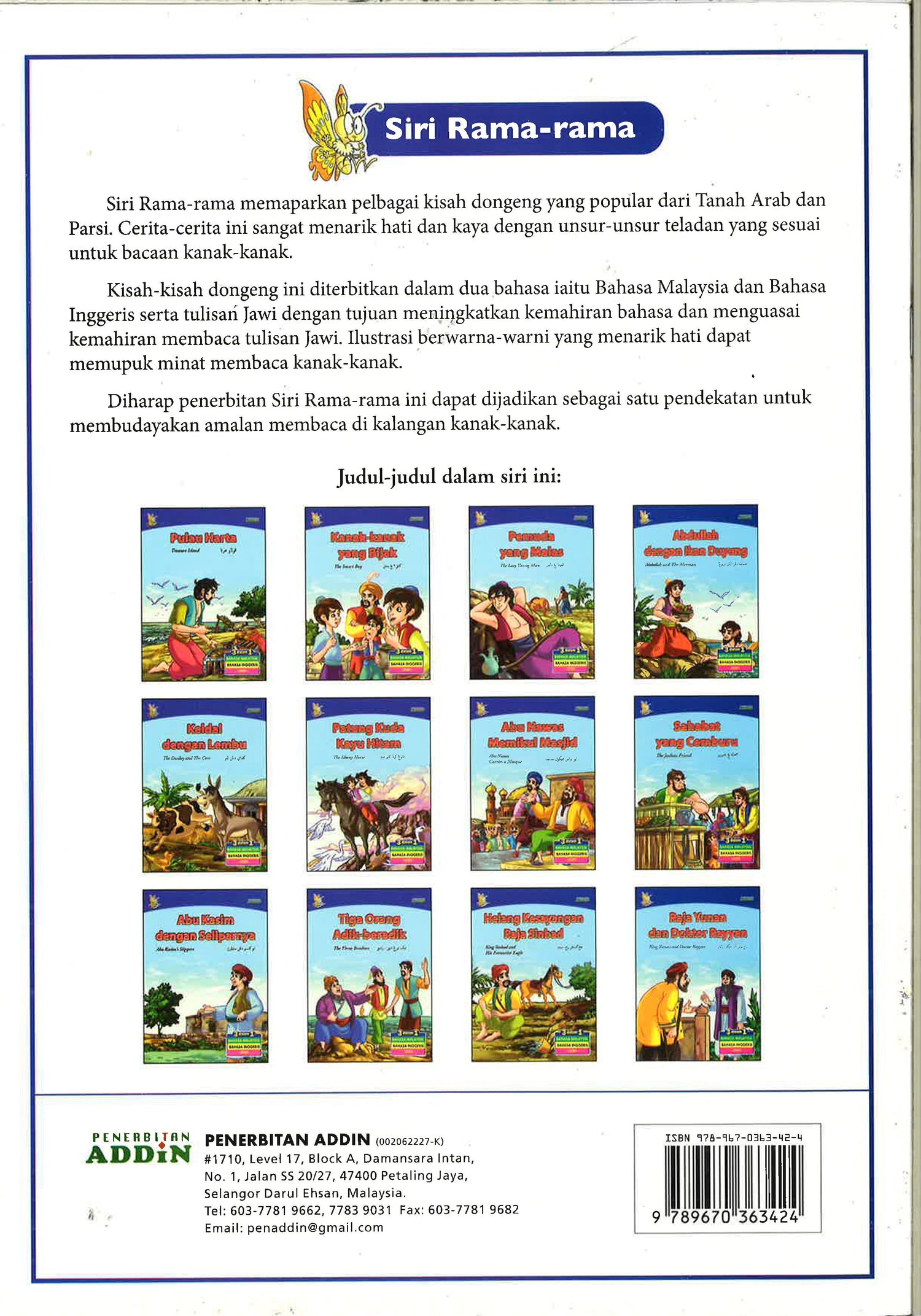Siri Rama-rama memaparkan pelbagai kisah dongeng yang popular dari Tanah Arab dan Parsi. Cerita-cerita ini sangat menarik hati dan kaya dengan unsur-unsur teladan yang sesuai untuk bacaan kanak-kanak.