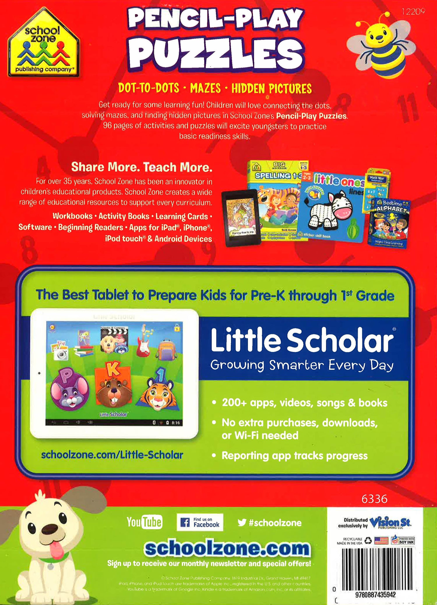 Get ready for some learning fun! Children will love connecting the dots, solving mazes, & finding hidden pictures in School Zone's Pencil-Play Puzzles. This book's 48x2-sided pages of activities & puzzles will excite youngsters to practice basic readiness skills.