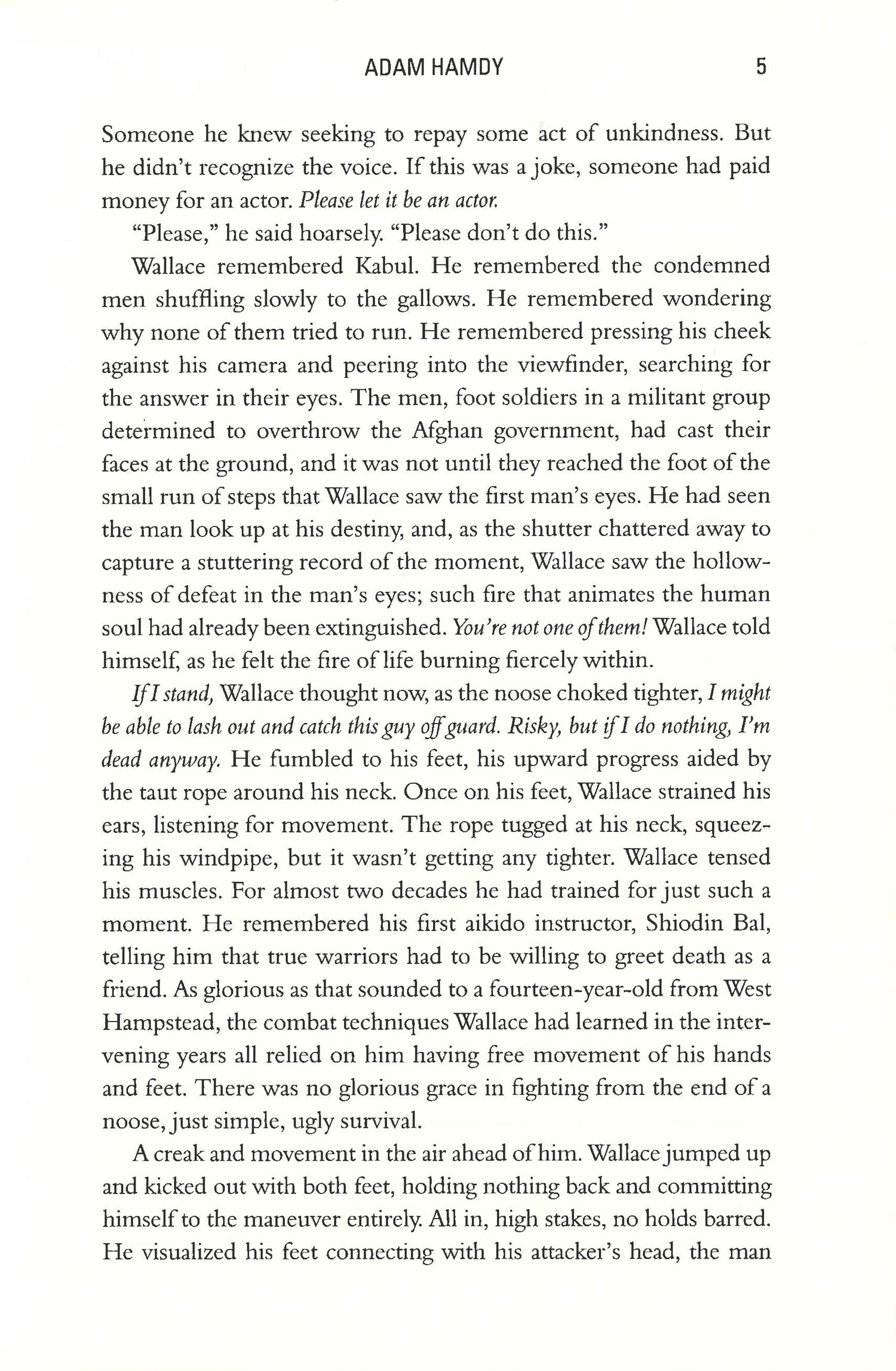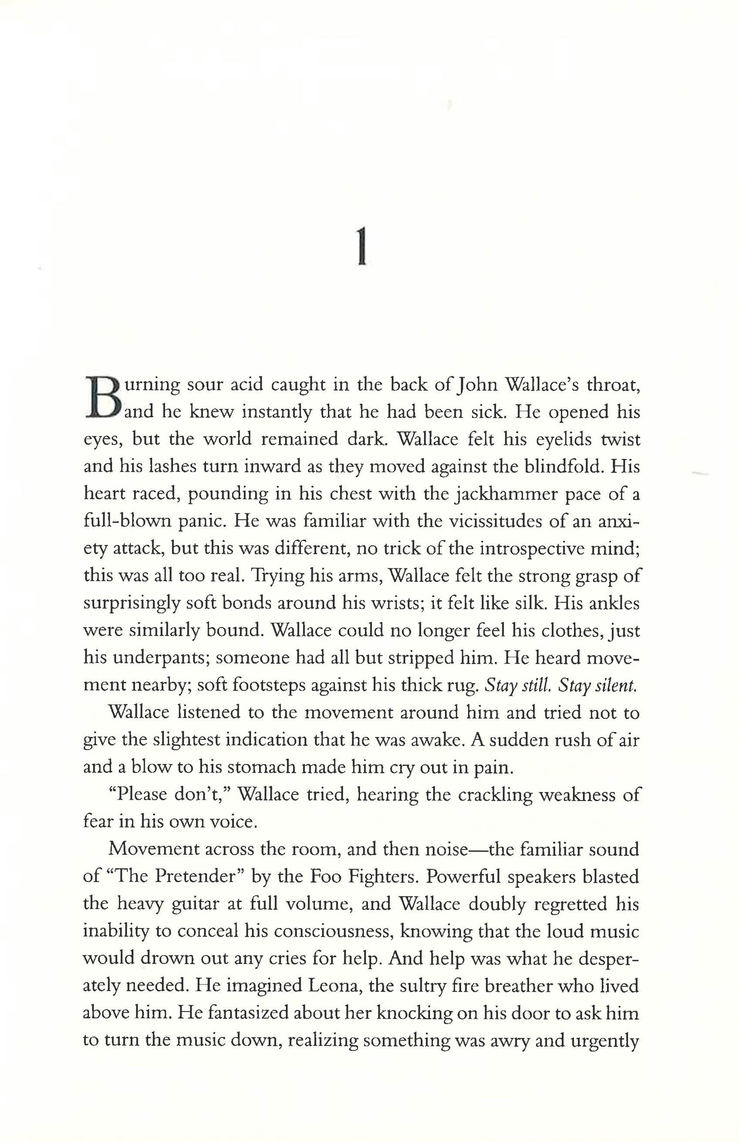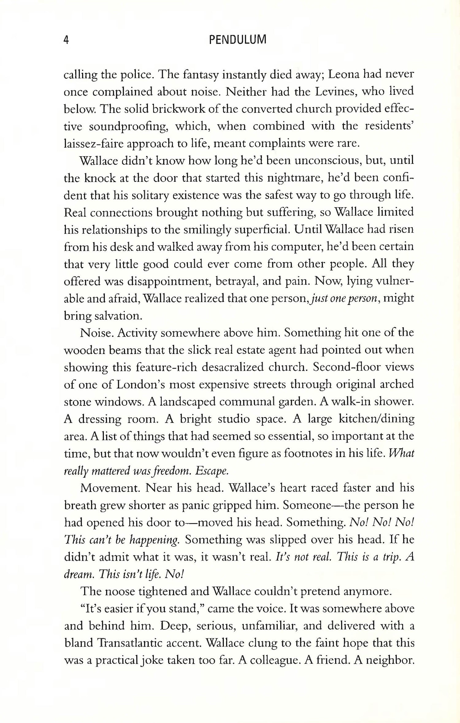 Solitary photojournalist John Wallace struggles to consciousness to find he has been bound and blindfolded by a masked man who is preparing to hang him in his own living room. Forced onto a chair with a noose around his neck, Wallace briefly reconsiders his mostly lonely life before the chair is kicked out beneath him and his world fades to black. Then he gets lucky and manages to escape his apartment, just ahead of his assailant. Bloody, barefoot, and with at least one broken rib, he has no choice but to run for his life. With no idea who would want to kill him, he makes it to the hospital and files a police report, but it soon becomes clear that as far as the authorities are concerned the only threat to Wallace's life is himself, and he is placed under suicide watch. When his would-be killer strikes again, Wallace realizes he will have to figure out who is hunting him and stop him on his own. The pendulum of fate swung briefly in his favor, but it's only a matter of time before its momentum carries it to the other side . . .