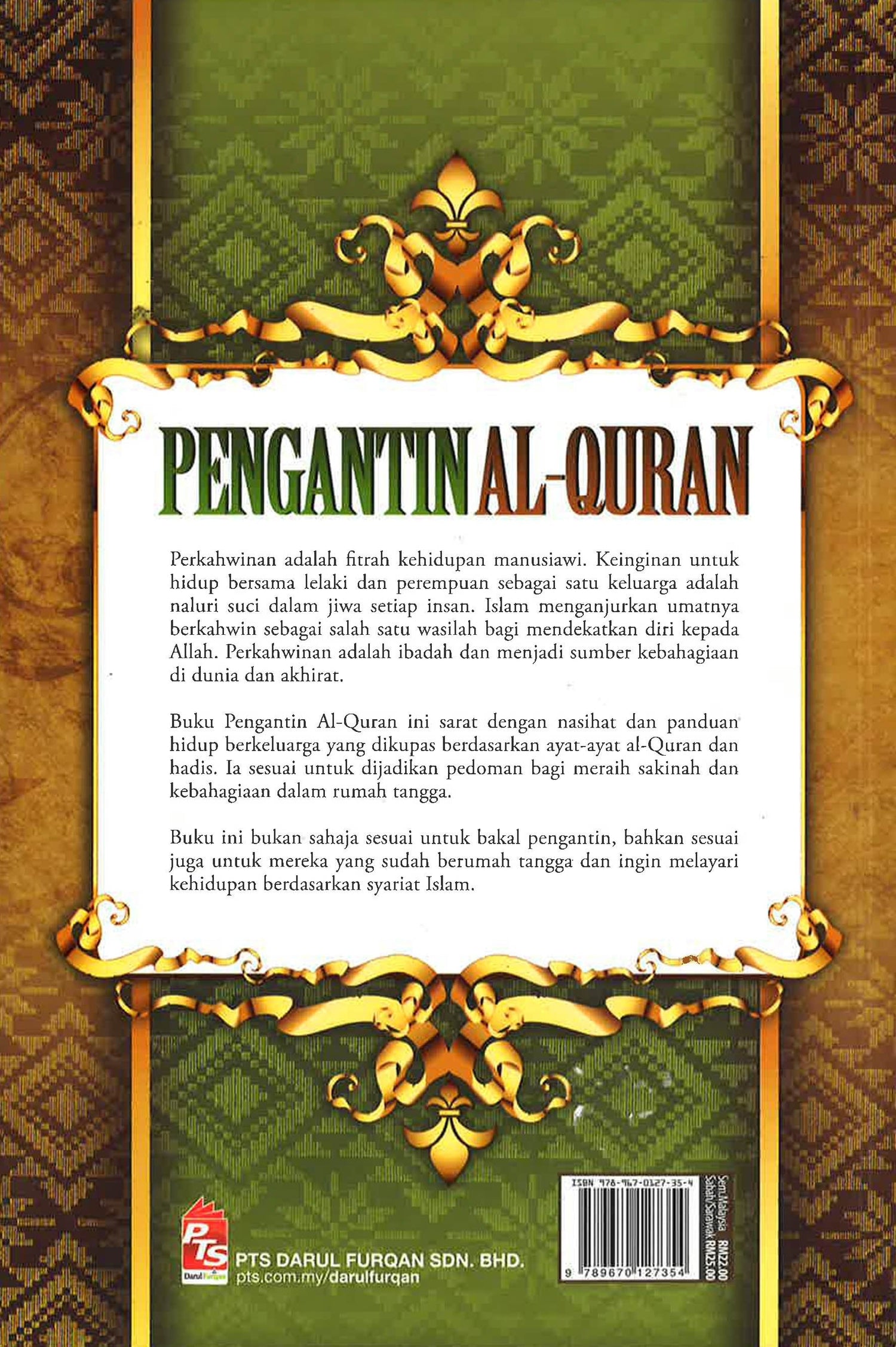 Buku Pengantin Al-Quran ini sarat dengan nasihat dan panduan hidup berkeluarga yang dikupas berdasarkan ayat-ayat al-Quran dan hadis. Ia sesuai untuk dijadikan pedoman bagi meraih sakinah dan kebahagiaan dalam rumah tangga.