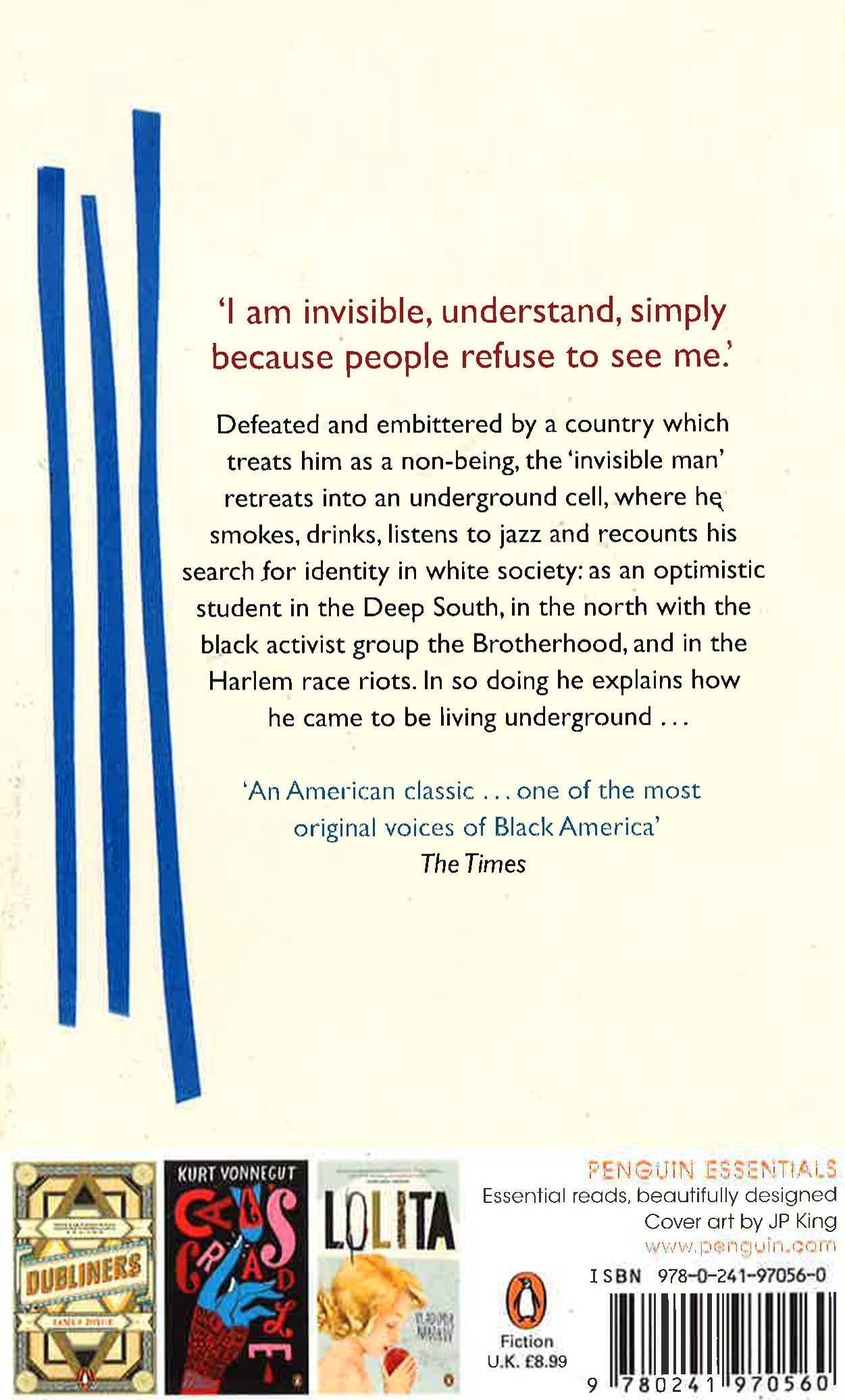 Defeated and embittered by a country which treats him as a non-being, the 'invisible man' retreats into an underground cell, where he smokes, drinks, listens to jazz and recounts his search for identity in white society: as an optimistic student in the Deep South, in the north with the black activist group the Brotherhood, and in the Harlem race riots. And explains how he came to be living underground . . .