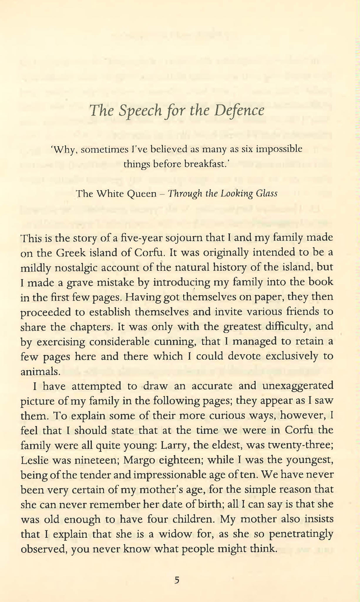 Escaping the ills of the British climate, the Durrell family - acne-ridden Margo, gun-toting Leslie, bookworm Lawrence and budding naturalist Gerry, along with their long-suffering mother and Roger the dog - take off for the island of Corfu.