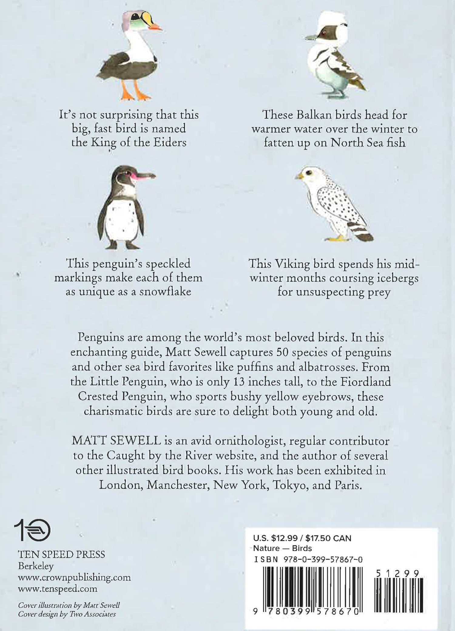 Penguins are among the world's most beloved birds. In this enchanting guide, Matt Sewell captures 50 species of penguins and other sea bird favorites like puffins and albatrosses. From the Little Penguin, who is only 13 inches tall, to the Fiordland Crested Penguin, who sports bushy yellow eyebrows, these charismatic birds are sure to delight both young and old.