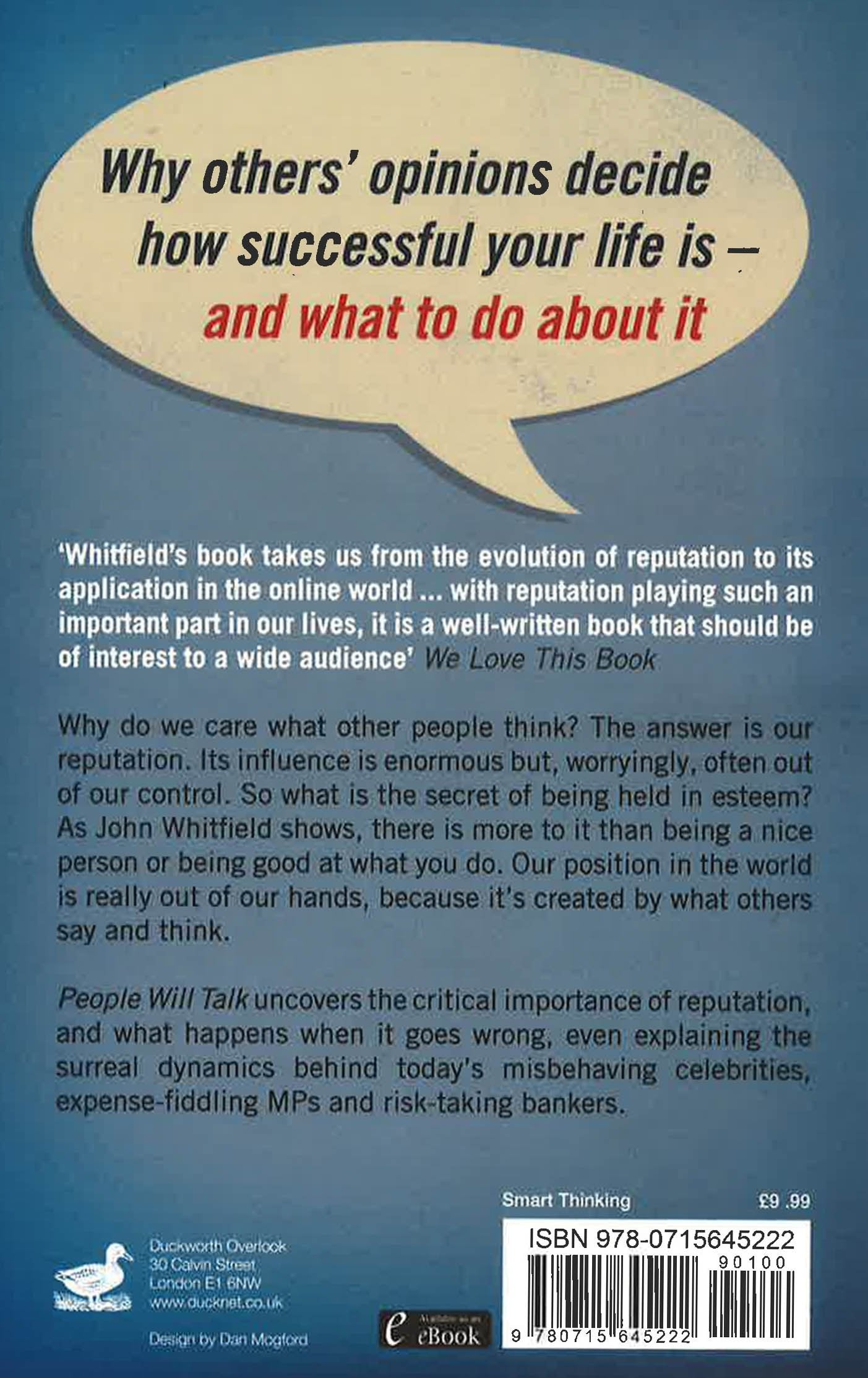 Why do we care what other people think? The answer is our reputation. Its influence is enormous but, worryingly, often out of our control. So what is the secret of being held in esteem? As John Whitfield shows, there is more to it than being a nice person or being good at what you do. Our position in the world is really in the hands of other people, because its created by what others say and think. People Will Talk uncovers the critical importance of reputation, and what happens when it goes wrong, even explaining the surreal dynamics behind todays misbehaving celebrities, expenses-fiddling MPs and risk-taking bankers.