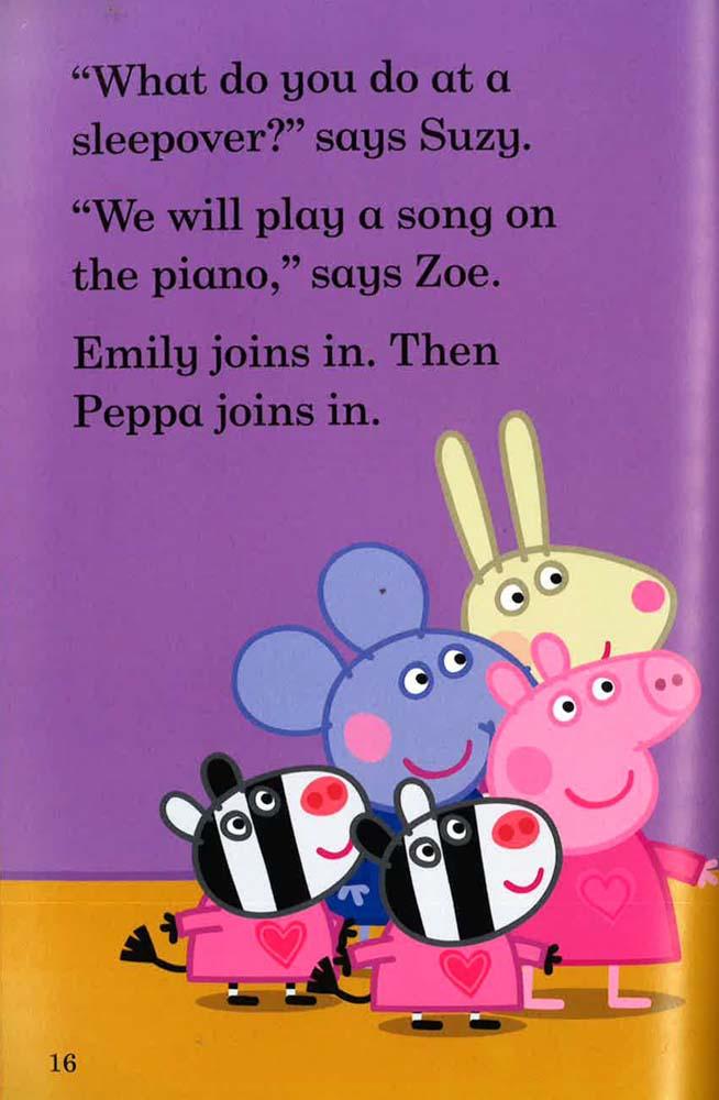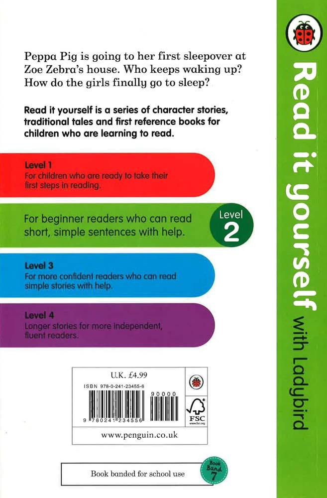 Based on the award-winning series, Peppa Pig, Peppa Pig: First Sleepover is a sweet and funny story, perfect for encouraging new readers. Peppa Pig is going to her very first sleepover at Zoe Zebra's house. The most important thing about a sleepover is that you must not sleep! With music, a midnight feast and a scary story, can Peppa and her friends stay awake? Read it yourself with Ladybird is one of Ladybird's best-selling reading series. For over thirty-five years it has helped young children who are learning to read develop and improve their reading skills. Each Read it yourself book is very carefully written to include many key, high-frequency words that are vital for learning to read, as well as a limited number of story words that are introduced and practised throughout. Simple sentences and frequently repeated words help to build the confidence of beginner readers and the four different levels of books support children all the way from very first reading practice through to independent, fluent reading. Each book has been carefully checked by educational consultants and can be read independently at home or used in a guided reading session at school. Further content includes comprehension puzzles, helpful notes for parents, carers and teachers, and book band information for use in schools. Peppa Pig: First Sleepover is a Level 2 Read it yourself book, ideal for children who have received some initial reading instruction and can read short, simple sentences with help.