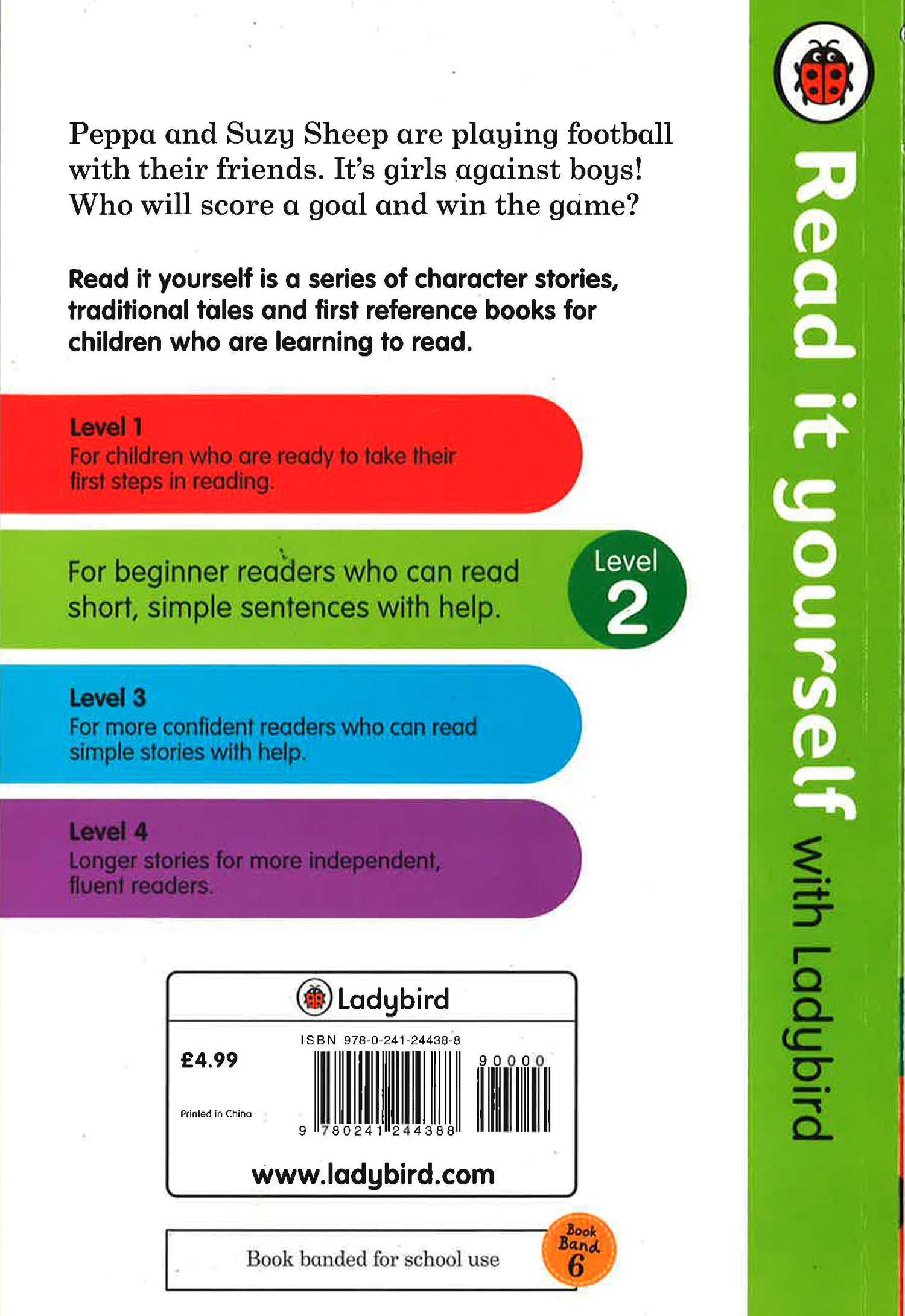 Peppa and her friends are playing a game of football. Who will be the winners? Each Read it yourself book is very carefully written to include many key, high-frequency words that are vital for learning to read, as well as a limited number of story words that are introduced and practised throughout. Simple sentences and frequently repeated words help to build the confidence of beginner readers and the four different levels of books support children all the way from very first reading practice through to independent, fluent reading. Each book has been carefully checked by educational consultants and can be read independently at home or used in a guided reading session at school. Further content includes comprehension puzzles, helpful notes for parents, carers and teachers, and book band information for use in schools. Peppa Pig: Playing Football is a Level 2 Read it yourself book, ideal for children who have received some initial reading instruction and can read short, simple sentences with help.