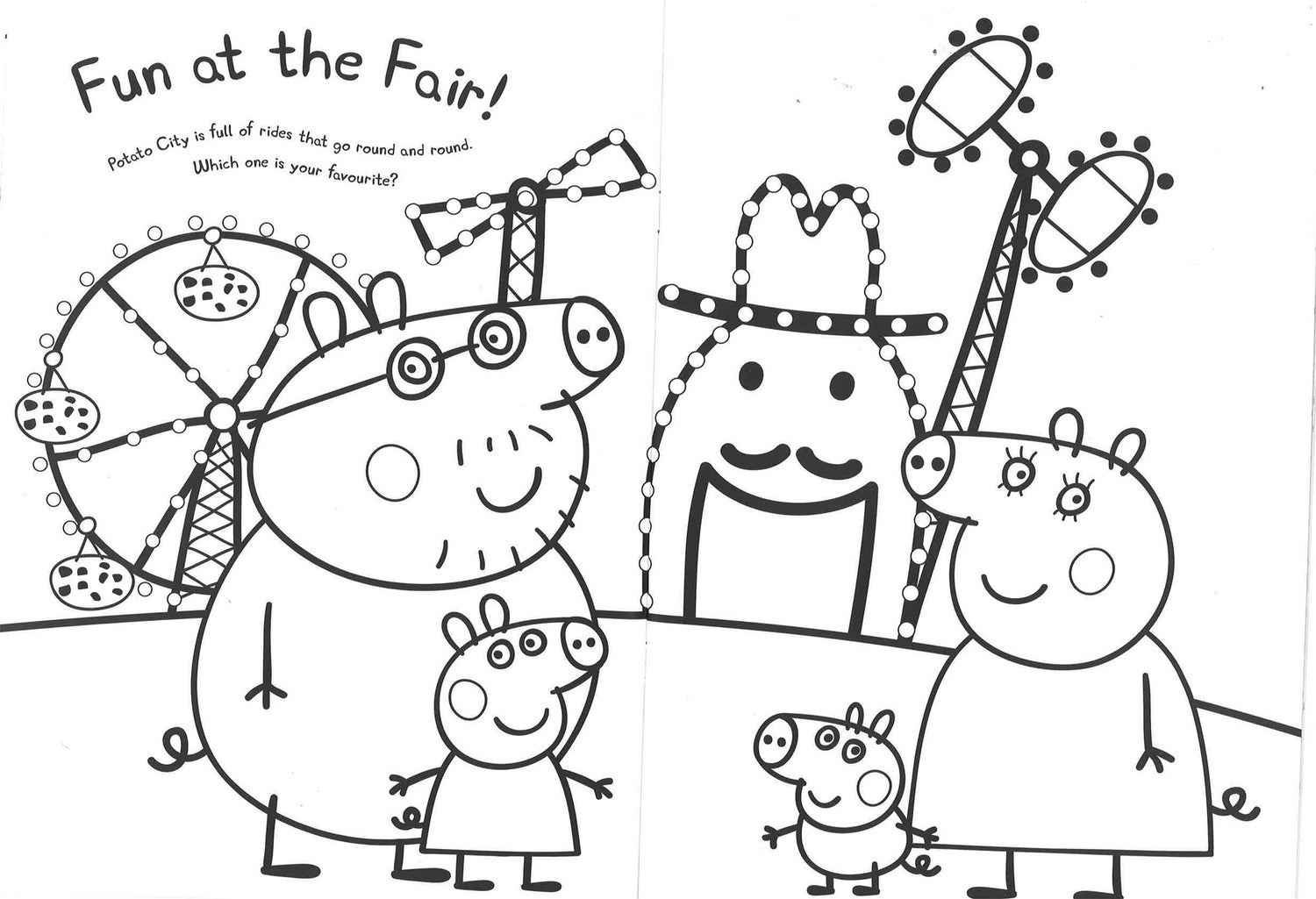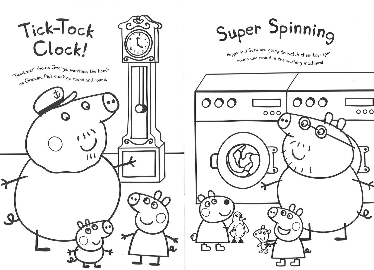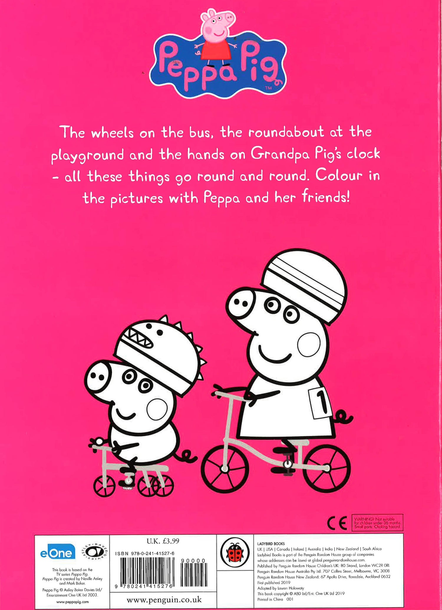 The wheels on the bus, the roundabout at the playground and the hands on Grandpa Pig's clock - all these things go round and round. Colour in the pictures with Peppa and her friends.