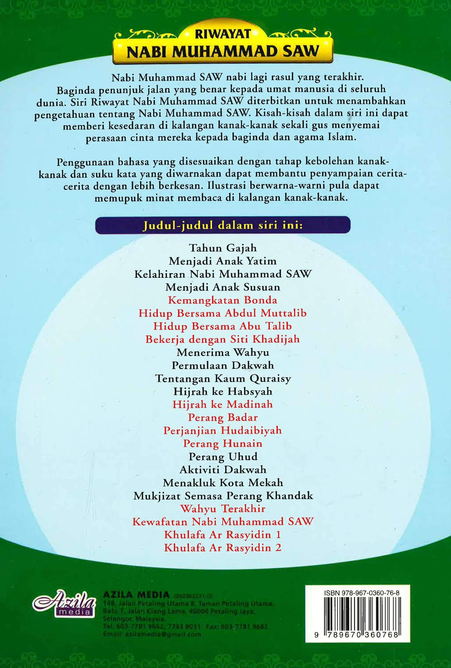 Nabi Muhammad SAW nabi lagi rasul yang terakhir. Baginda penunjuk jalan yang benar kepada umat manusia di seluruh dunia. Siri Riwayat Nabi Muhammad SAW diterbitkan untuk menambahkan pengetahuan tentang Nabi Muhammad SAW. Kisah-kisah dalam siri ini dapat memberi kesedaran di kalangan kanak-kanak sekali gus menyemai perasaan cinta mereka kepada baginda dan agama Islam. Penggunaan bahasa yang disesuaikan dengan tahap kebolehan kanak kanak dan suku kata yang diwarnakan dapat membantu penyampaian cerita cerita dengan lebih berkesan. Ilustrasi berwarna-warni pula dapat memupuk minat membaca di kalangan kanak-kanak