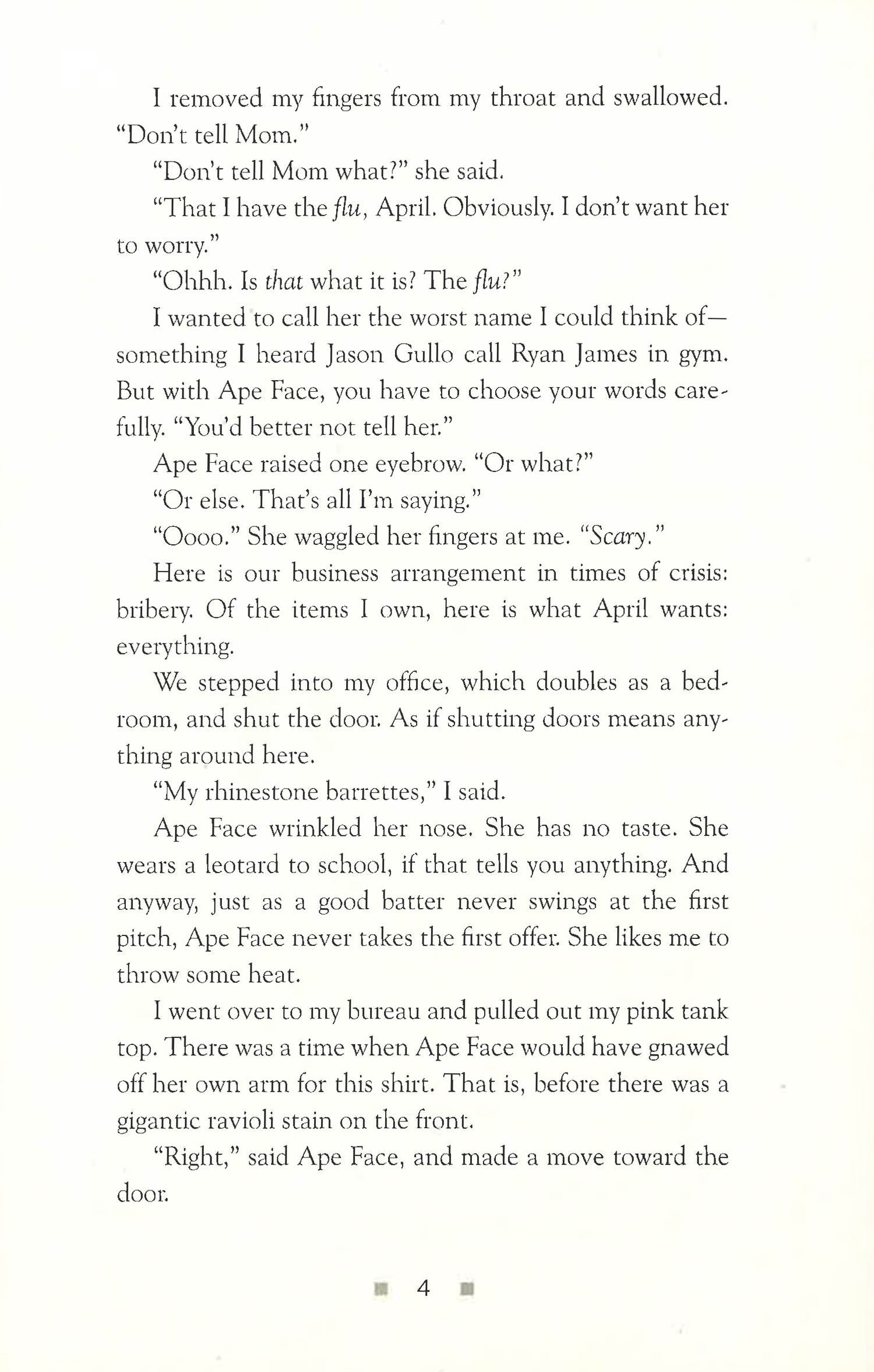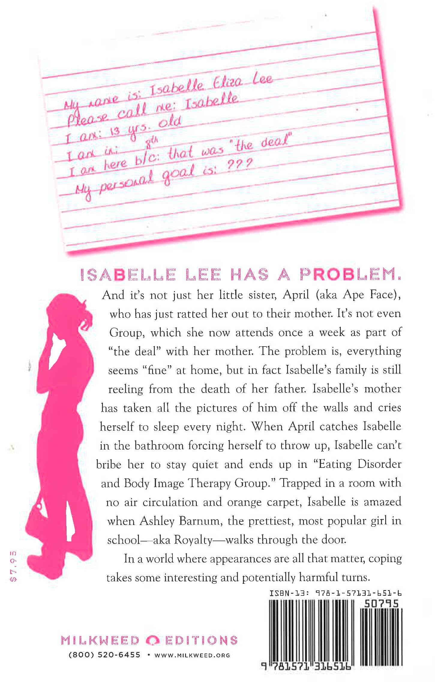 But everything is not normal, really. Since the dealth of her father, Isabelle's family has only functioned on the surface. Her mother, who used to take care of herself, now wears only lumpy, ill-fitting clothes, cries all night, and has taken every picture of her dead husband and put them under her bed. Isabelle tries to make light of this, but the underlying tension is expressed in overeating and then binging. As the novel opens, Isabelle's little sister, April, has told their mother about Isabelle's problem. Isabelle is enrolled in group therapy. Who should show up there, too, but Ashley Barnum, the prettiest, most together girl in class.