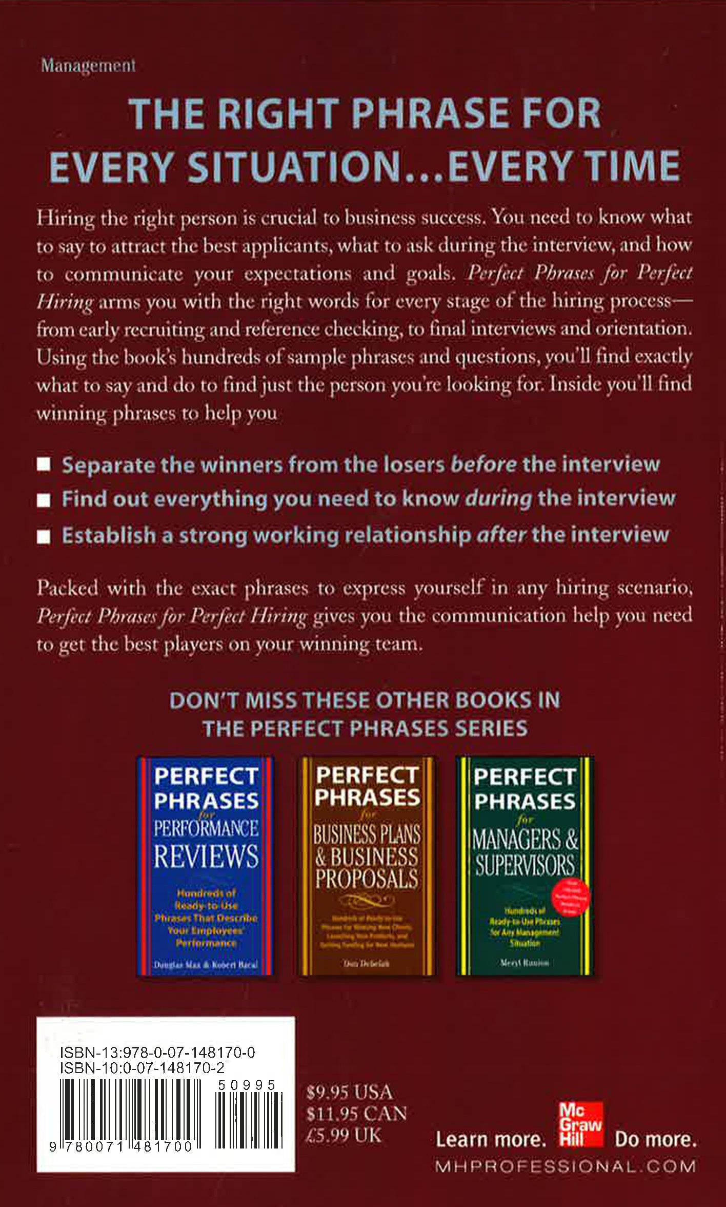 The Right Phrase for Every Situation...Every Time. Hiring the right person is crucial to business success. You need to know what to say to attract the best applicants, what to ask during the interview, and how to communicate your expectations and goals. Perfect Phrases for Perfect Hiring arms you with the right words for every stage of the hiring process-from early recruiting and reference checking, to final interviews and orientation. Using the book's hundreds of sample phrases and questions, you'll find exactly what to say and do to find just the person you're looking for. Inside you'll find winning phrases to help you. Separate the winners from the losers before the interview. Find out everything you need to know during the interview. Establish a strong working relationship after the interview. Packed with the exact phrase to express yourself in any hiring scenario, Perfect Phrases for Perfect Hiring gives you the communication help you need to get the best players on your winning team.