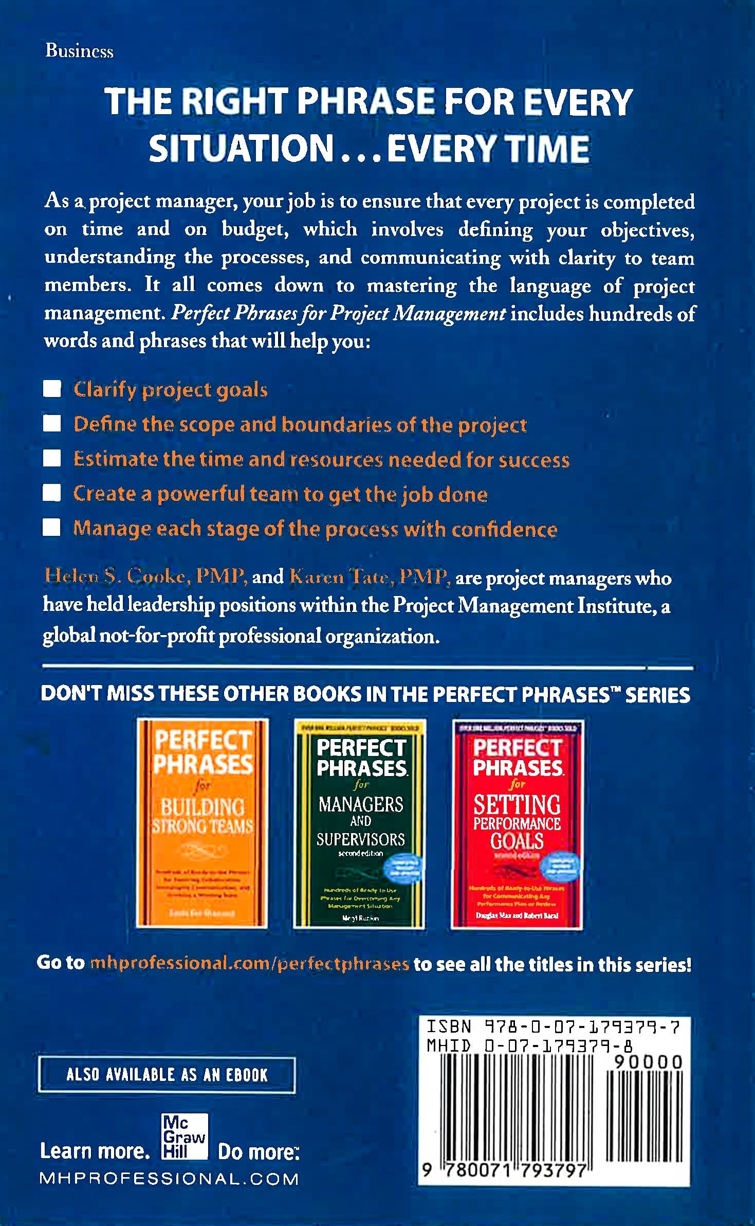 THE RIGHT PHRASE FOR EVERY SITUATION . . . EVERY TIMEAs a project manager, your job is to ensure that every project is completed on time and on budget, which involves defining your objectives, understanding the processes, and communicating with clarity to team members. It all comes down to mastering the language of project management. Perfect Phrases for Project Management includes hundreds of words and phrases that will help you:Clarify project goalsDefine the scope and boundaries of the projectEstimate the time and resources needed for successCreate a powerful team to get the job doneManage each stage of the process with confidence