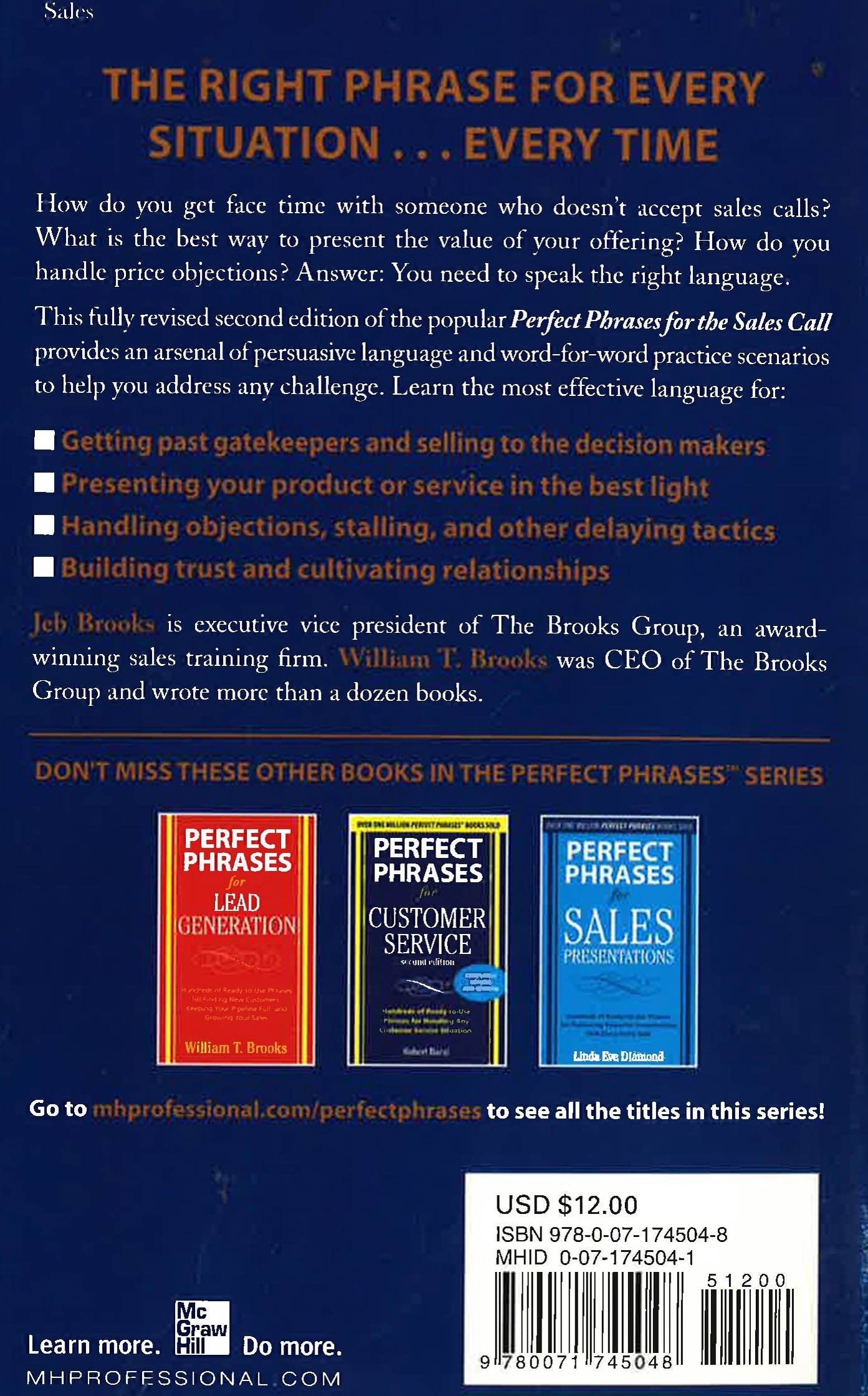 THE RIGHT PHRASE FOR EVERY SITUATION . . . EVERY TIMEDON'T MISS THESE OTHER BOOKS IN THE PERFECT PHRASES SERIESHow do you get face time with someone who doesn't accept sales calls? What is the best way to present the value of your offering? How do you handle price objections? Answer: You need to speak the right language.This fully revised second edition of the popular Perfect Phrases for the Sales Call provides an arsenal of persuasive language and word-for-word practice scenarios to help you address any challenge. Learn the most effective language for: