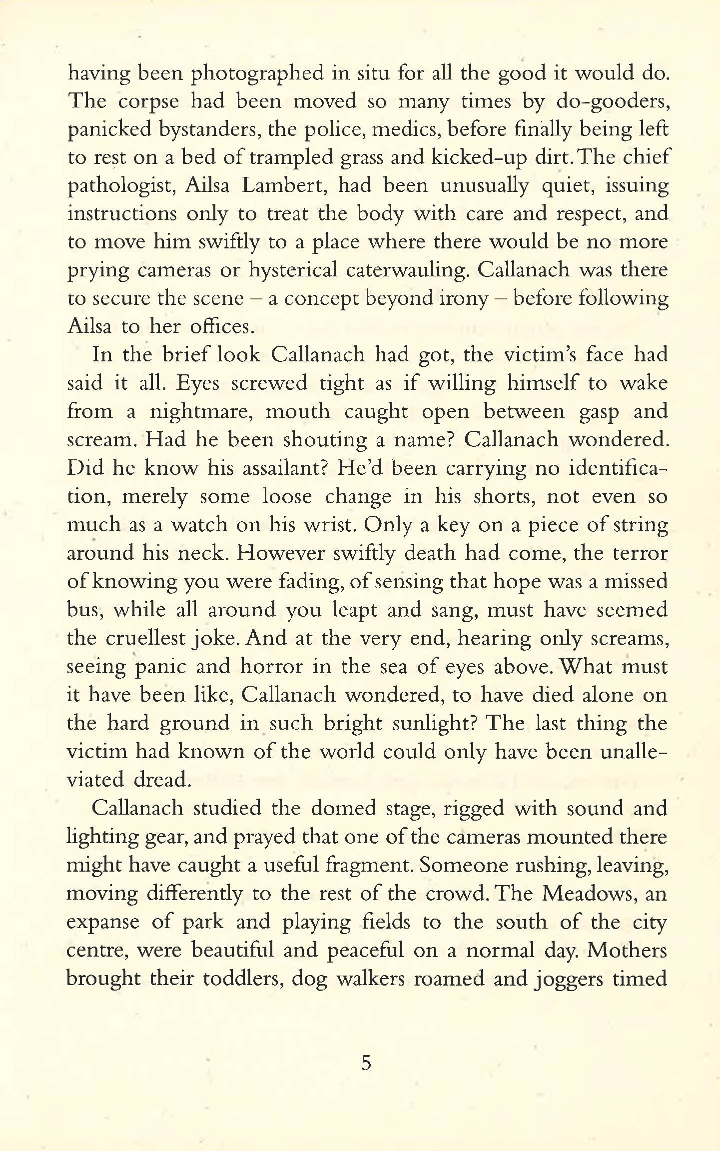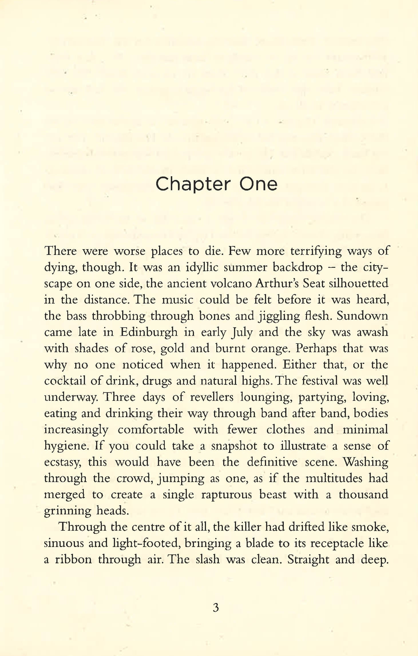The following week, the body of a primary school teacher is found in a dumpster in an Edinburgh alley, strangled with her own woollen scarf.