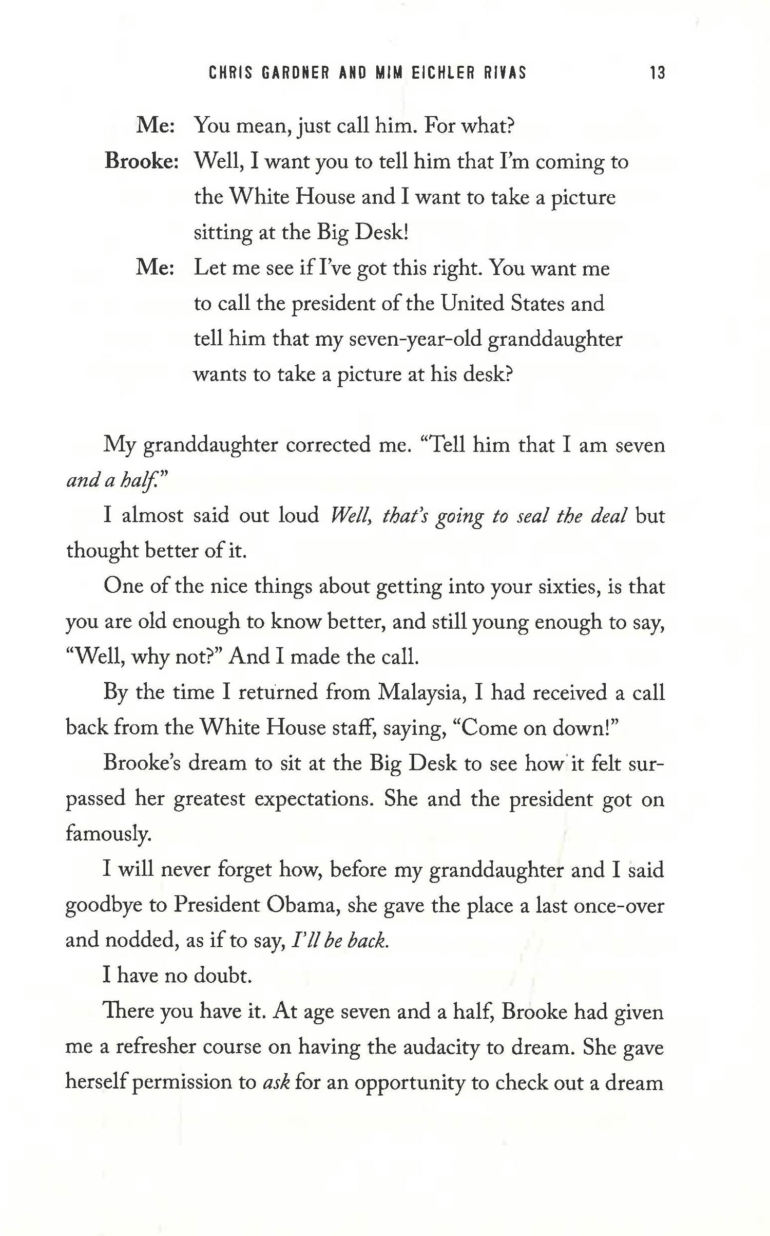 . No matter how much wealth you achieve, Chris notes, true success comes from enriching the lives of otherness all can still have access to the American dream. Chris, hearing her, realizes what his next pursuit will be-to go back to high School and give permission to dream to the next generation of problem solvers and change makers.. About the Author Chris Gardner is the CEO of Happyness