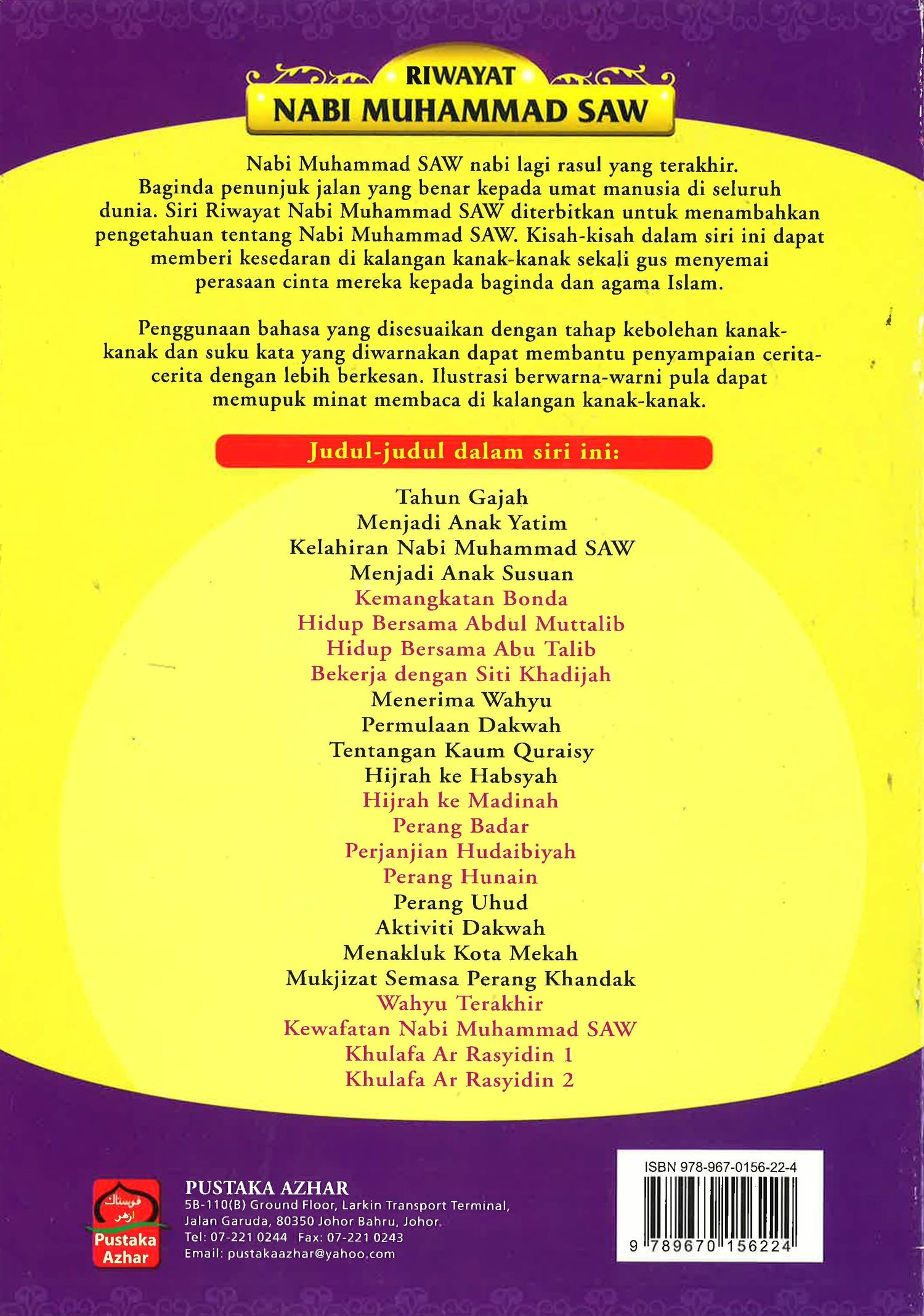 Nabi Muhammad SAW nabi lagi rasul yang terakhir. Baginda penunjuk jalan yang benar kepada umat manusia di seluruh dunia. Siri Riwayat Nabi Muhammad SAW diterbitkan untuk menambahkan pengetahuan tentang Nabi Muhammad SAW. Kisah-kisah dalam siri ini dapat memberi kesedaran di kalangan kanak-kanak sekali gus menyemai perasaan cinta mereka kepada baginda dan agama Islam. Penggunaan bahasa yang disesuaikan dengan tahap kebolehan kanak kanak dan suku kata yang diwarnakan dapat membantu penyampaian cerita cerita dengan lebih berkesan. Ilustrasi berwarna-warni pula dapat memupuk minat membaca di kalangan kanak-kanak.