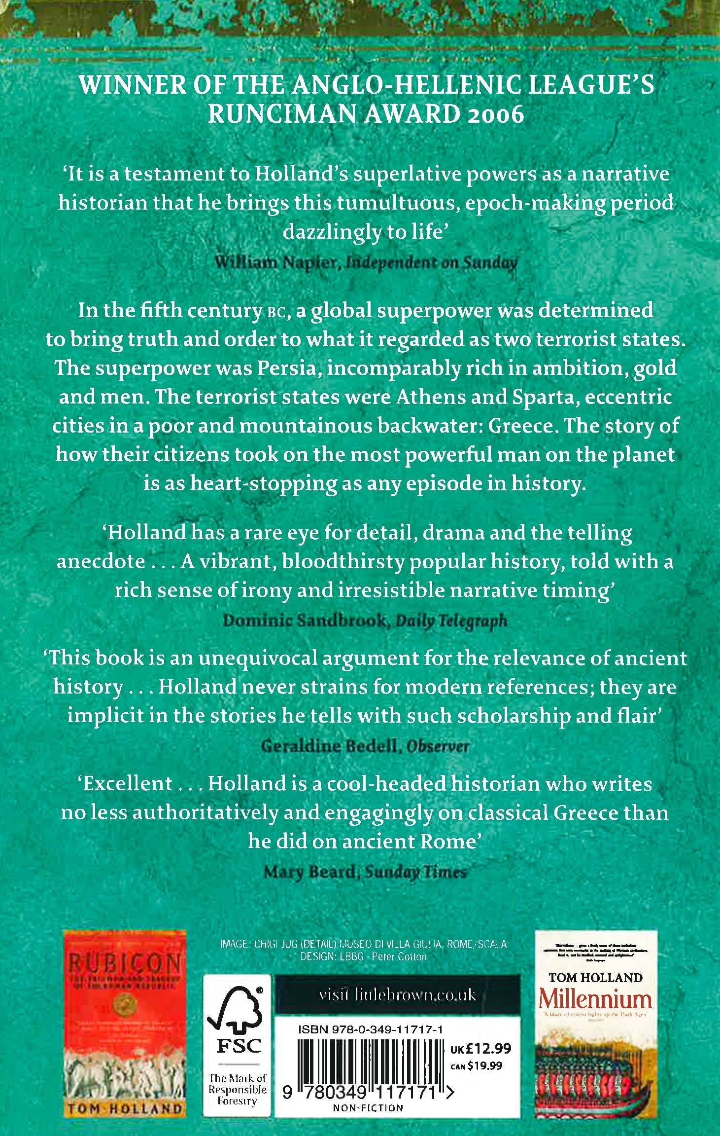 In 480 BC, Xerxes, the King of Persia, led an invasion of mainland Greece. Its success should have been a formality. For seventy years, victory - rapid, spectacular victory - had seemed the birthright of the Persian Empire. In the space of a single generation, they had swept across the Near East, shattering ancient kingdoms, storming famous cities, putting together an empire which stretched from India to the shores of the Aegean. As a result of those conquests, Xerxes ruled as the most powerful man on the planet. Yet somehow, astonishingly, against the largest expeditionary force ever assembled, the Greeks of the mainland managed to hold out. The Persians were turned back. Greece remained free. Had the Greeks been defeated at Salamis, not only would the West have lost its first struggle for independence and survival, but it is unlikely that there would ever have been such and entity as the West at all.Tom Holland's brilliant new book describes the very first 'clash of Empires' between East and West. Once again he has found extraordinary parallels between the ancient world and our own. There is no competing popular book describing these events.