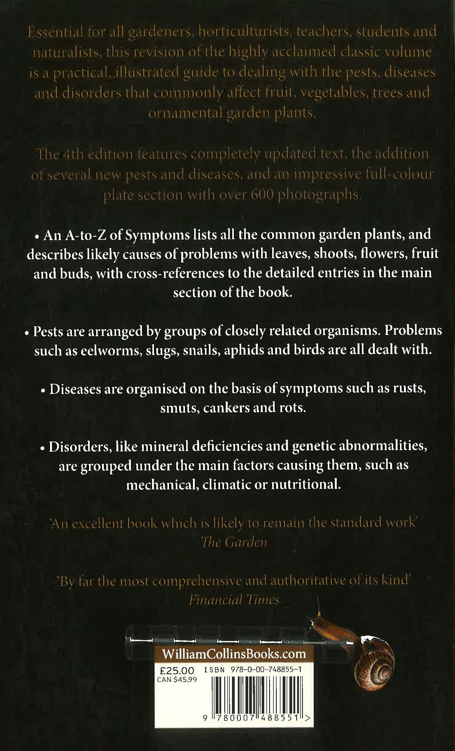 Essential for all gardeners, horticulturists and naturalists, this is a practical, highly-illustrated guide to dealing with disorders that affect fruit, vegetables, trees and ornamental garden plants. A revision of the highly acclaimed Collins Guide to Pests, Diseases and Disorders first published in 1981, the book now features completely updated text, the addition of several new pests and diseases that have become a threat in the last decade, and an impressive full colour plate section with over 600 photographs. The Introduction provides general information about garden hygiene and plant care and control, including an assessment of pesticides and chemicals. Special attention is given to the increasing importance of biological control in gardens.*The A-to-Z of Symptoms lists all the common garden plants, and describes likely causes of problems with leaves, shoots, flowers, fruit and buds, with cross-references to the detailed entries in the main section of the book.*Pests are arranged by groups of closely related organisms. Problems such as eelworms, slugs, snails, aphids and birds are all dealt with.*Diseases are organised on the basis of symptoms such as rusts, smuts, cankers and rots.*Disorders, like mineral deficiencies and genetic abnormalities, are grouped under the main factors causing them - mechanical, climatic, nutritional etc.