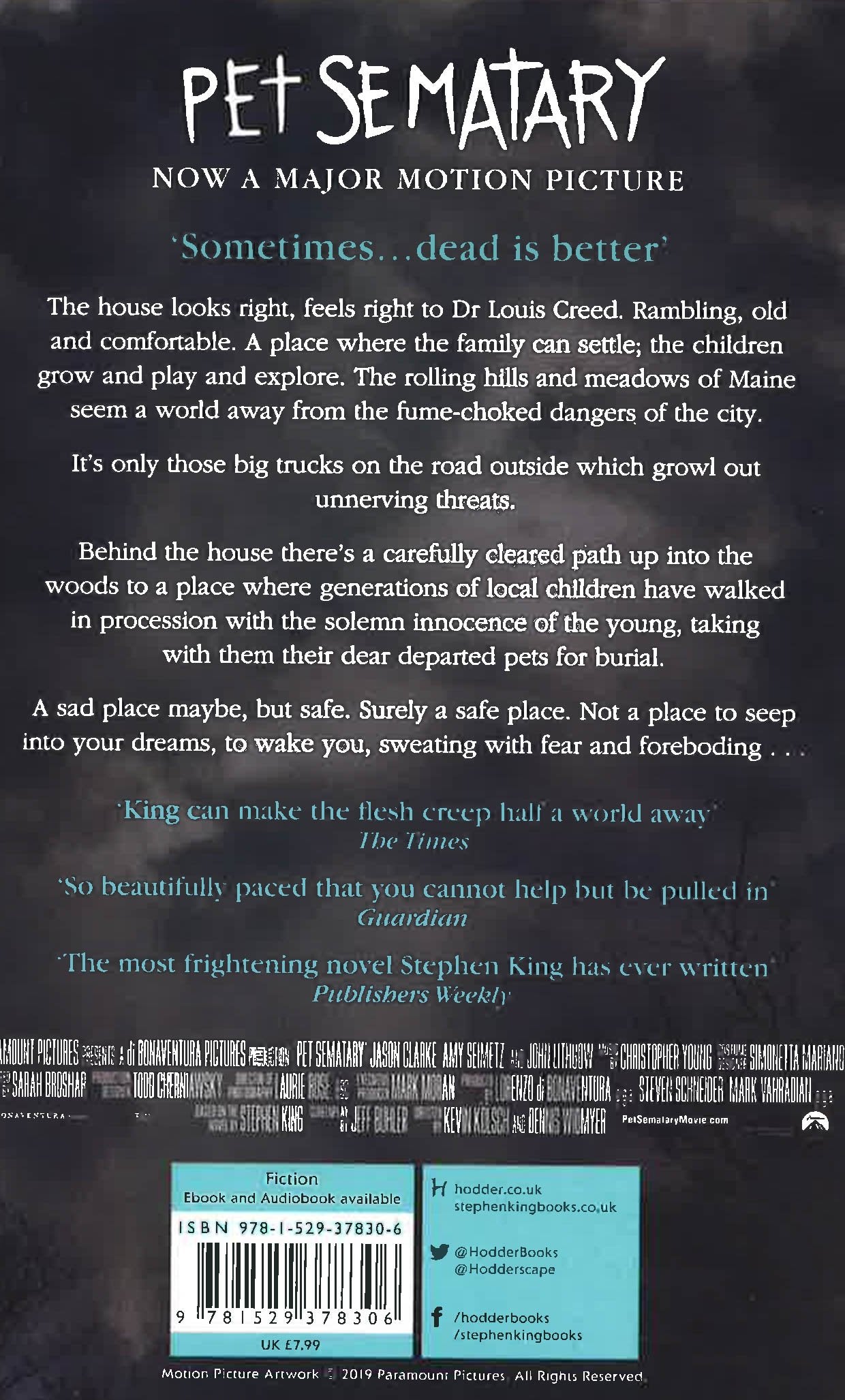 Soon to be a major motion picture from Paramount Pictures starring John Lithgow, Jason Clarke, and Amy Seimetz! Stephen King’s #1 New York Times bestseller Pet Sematary, a “wild, powerful, disturbing” (The Washington Post Book World) classic about evil that exists far beyond the grave—among King’s most iconic and beloved novels. When Dr. Louis Creed takes a new job and moves his family to the idyllic rural town of Ludlow, Maine, this new beginning seems too good to be true. Despite Ludlow’s tranquility, an undercurrent of danger exists here. Those trucks on the road outside the Creed’s beautiful old home travel by just a little too quickly, for one thing…as is evidenced by the makeshift graveyard in the nearby woods where generations of children have buried their beloved pets. Then there are the warnings to Louis both real and from the depths of his nightmares that he should not venture beyond the borders of this little graveyard where another burial ground lures with seductive promises and ungodly temptations. A blood-chilling truth is hidden there—one more terrifying than death itself, and hideously more powerful. As Louis is about to discover for himself sometimes, dead is better…