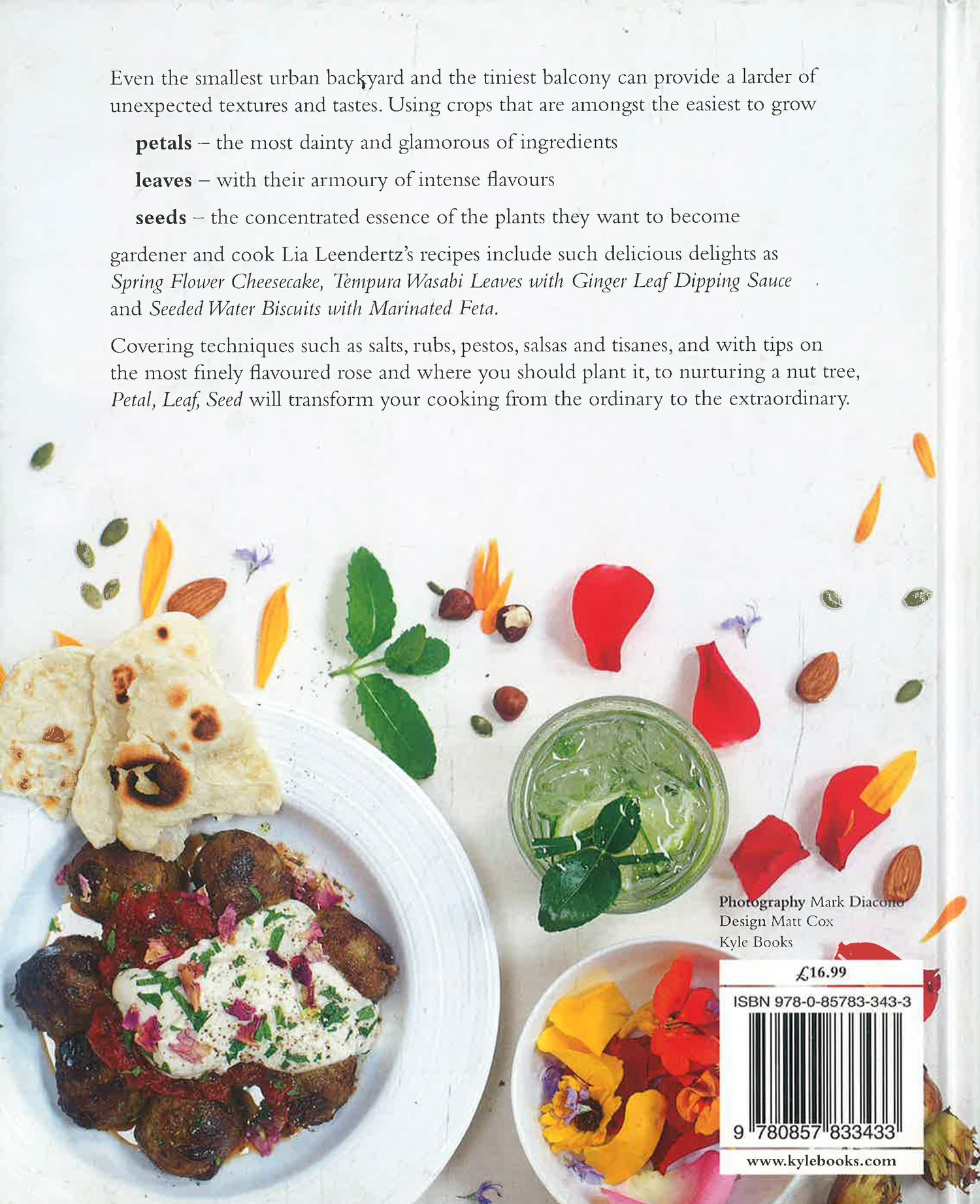 Petal, Leaf, Seed shows you how to unlock the hidden larder of tastes and textures in your garden. Many of the ingredients are amongst the smallest and easiest crops you can grow, but will provide you with some of the biggest flavours. Divided into three sections, each of which has its own growing guide, Petal covers spring, summer, herb and vegetable flowers; Leaf covers annual and perennial herbs, exotic and fruit leaves; Seed covers nuts, and herb, vegetable and flower seeds. The more than 60 recipes use techniques such as crystallising, infusions, salts, rubs and condiments, salsas and tisanes, and pastry, pasta and batters. As well as basil and mint sugar to scatter on your summer fruit and fig leaf schnapps, they include seeded water biscuits with marinated feta, tempura wasabi leaves with ginger leaf dipping sauce, hot and sour beef salad with mustard flowers, and spring flower cheesecake.