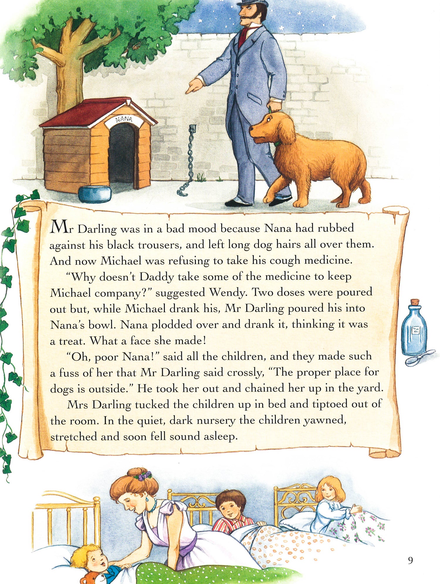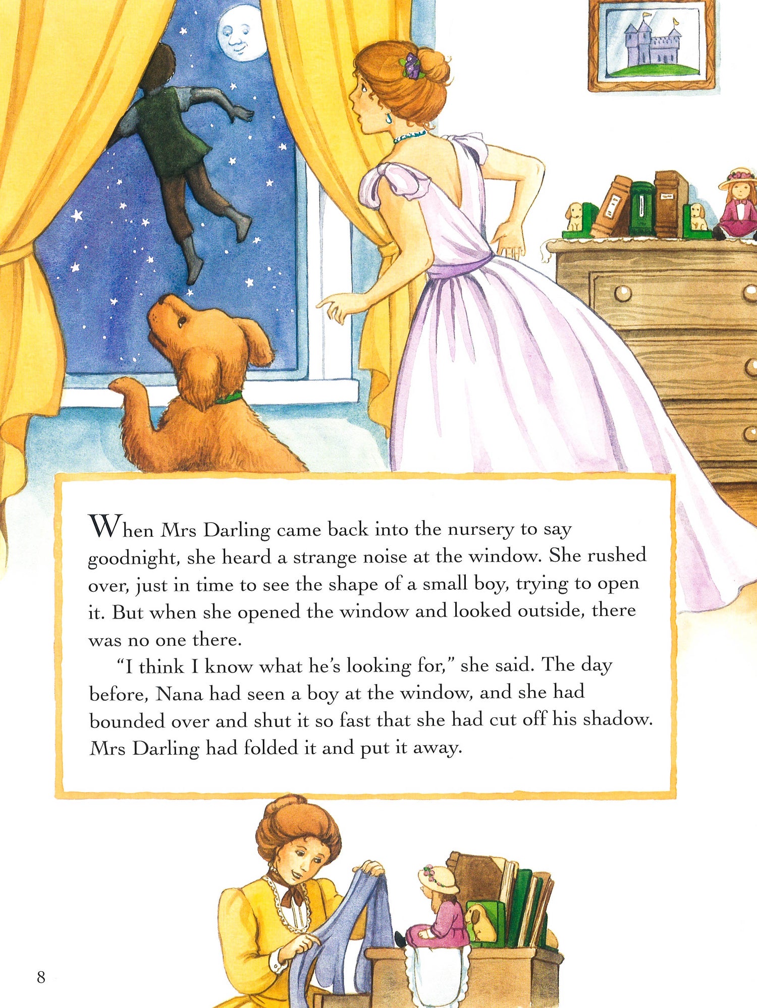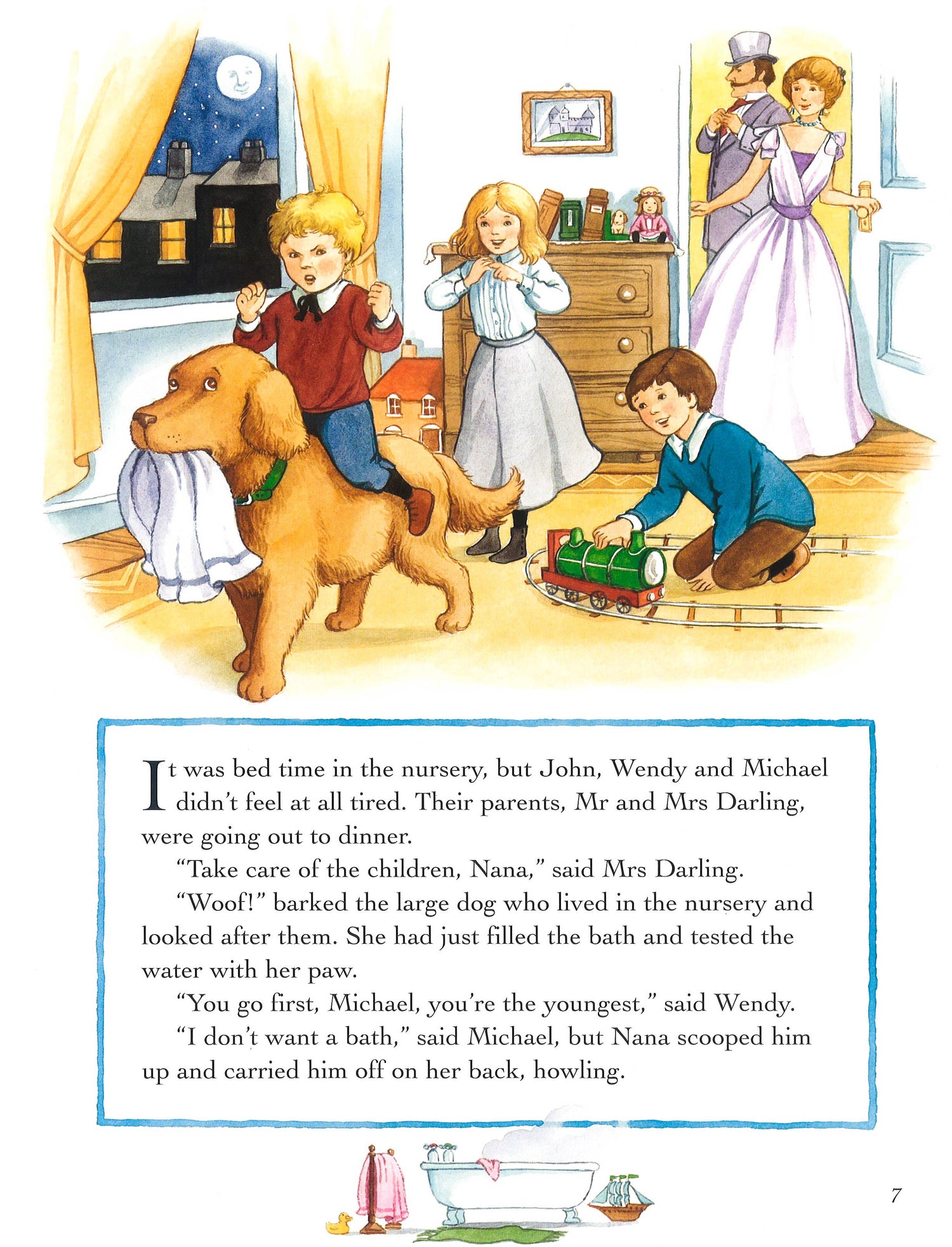 This is a fresh new version of J M Barrie's classic tale about the little boy who refused to grow up, specially adapted by Lesley Young. It provides bright illustrations by Jenny Press portray. Peter's exciting adventures in Never-Never Land with the fairy Tinker Bell and his new friends Wendy, John and Michael. Meet Tiger Lily, the brave Indian chief, and the villainous pirates commanded by Captain Hook. The lively narrative is carefully worded to appeal to youngsters - perfect for reading aloud to small children, or for more confident readers to enjoy by themselves. Little Wendy Darling awakes one night to find Peter Pan in the bedroom she shares with her brothers, John and Michael. Peter is searching for his missing shadow. After Wendy helps Peter to reattach his shadow, he offers to take her and her brothers to the magical realm of Never-Never Land. This is a world inhabited by mermaids, the Lost Boys - children who fell out of their prams when their mothers were not looking - friendly Indians and terrifying pirates. Together, Peter and his pals do battle against the pirates' infamous leader, Captain Hook...
